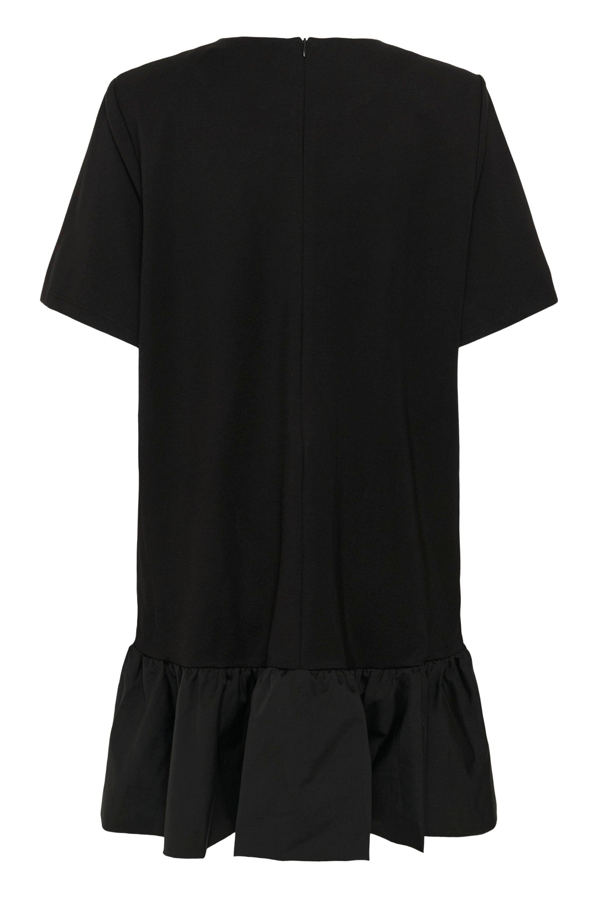 Sort kjole fra Gestuz med korte ærmer og rund halsudskæring. Kjolen har en løs pasform og et rynket skørt forneden.