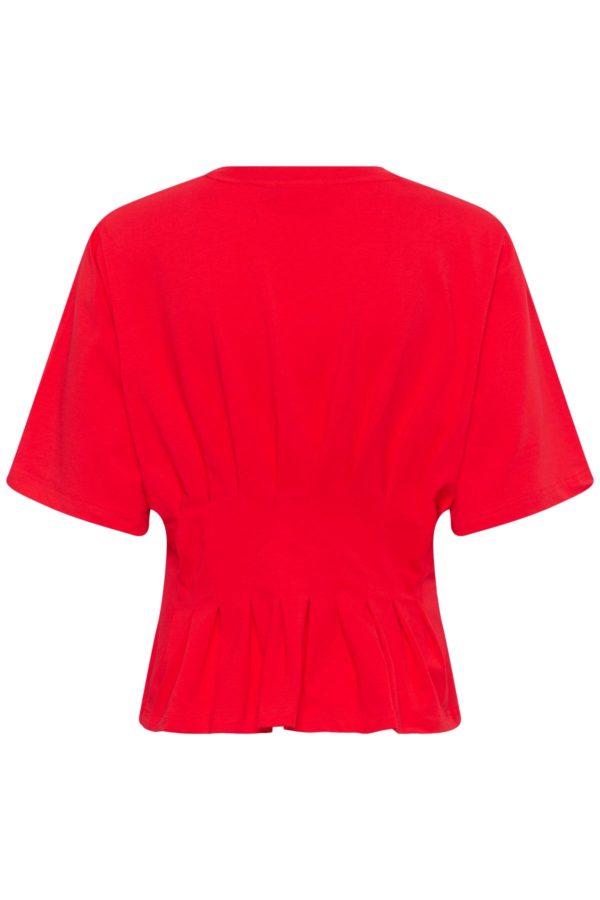 Rød t-shirt fra Gestuz med rynker i taljeområdet. T-shirten har korte ærmer og en rund hals.