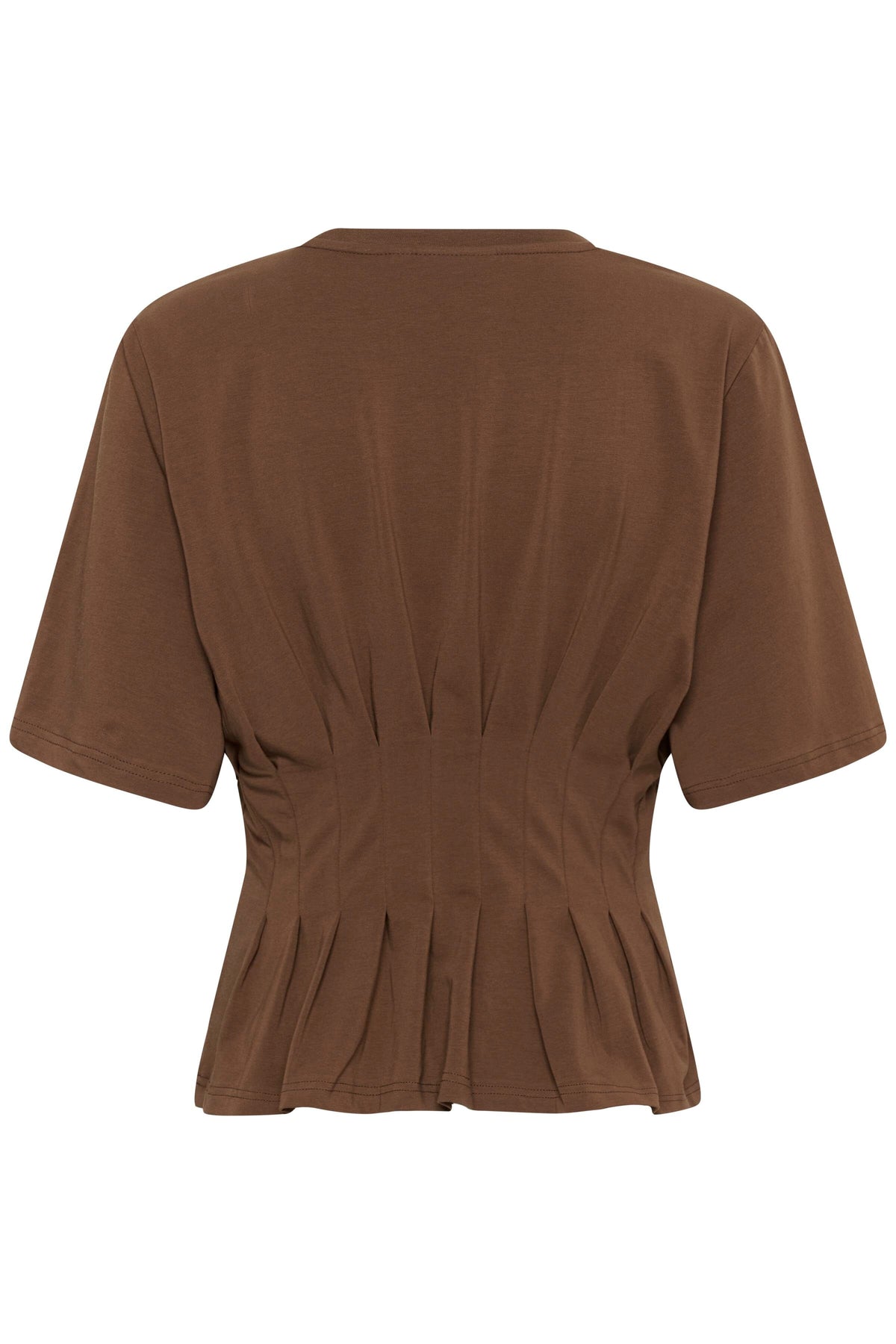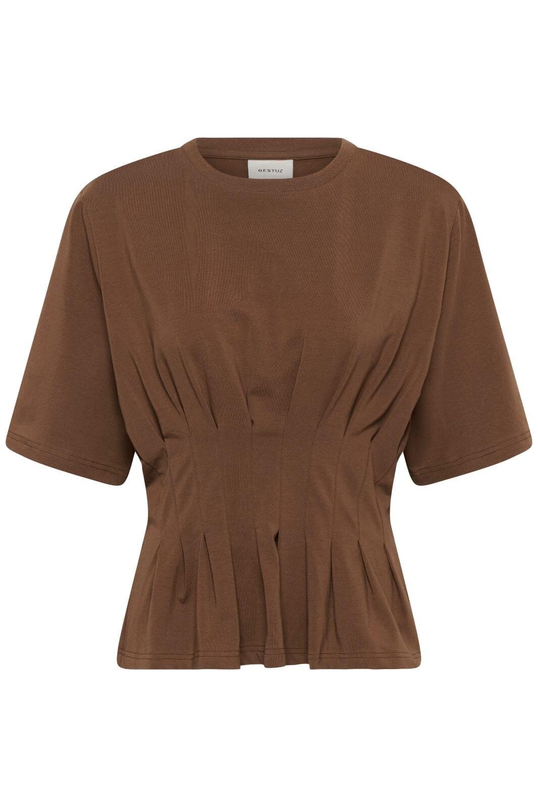 Brun T-shirt fra Gestuz med plisseret design i taljen. T-shirten har en rund halsudskæring, korte ærmer og en tætsiddende pasform.