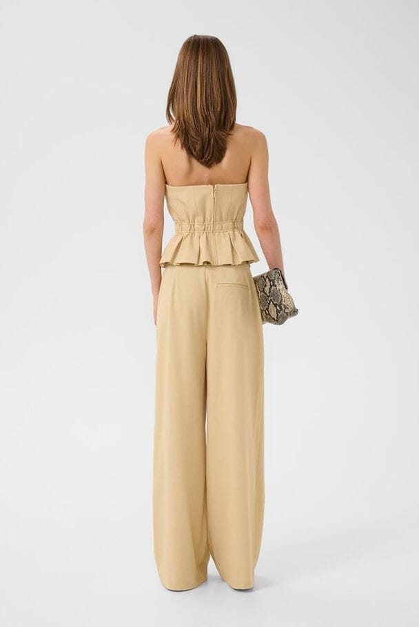 Bukser fra Gestuz i en løs pasform med brede ben. Bukserne har en lys beige meleret farve og en gulvlang længde.