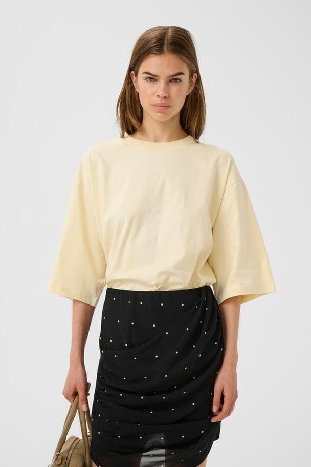 Lysegul T-shirt fra Gestuz, lavet af 100 % økologisk bomuld. T-shirten har en broderet detalje på brystet og en oversized pasform.