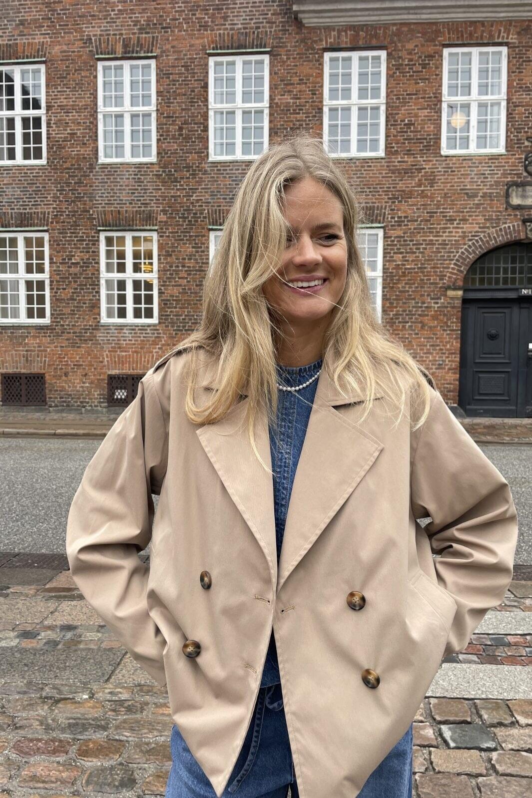 Beige jakke fra Global Funk med dobbeltradet front. Den har store knapper og en klassisk krave, som giver jakken et rent og enkelt udtryk.