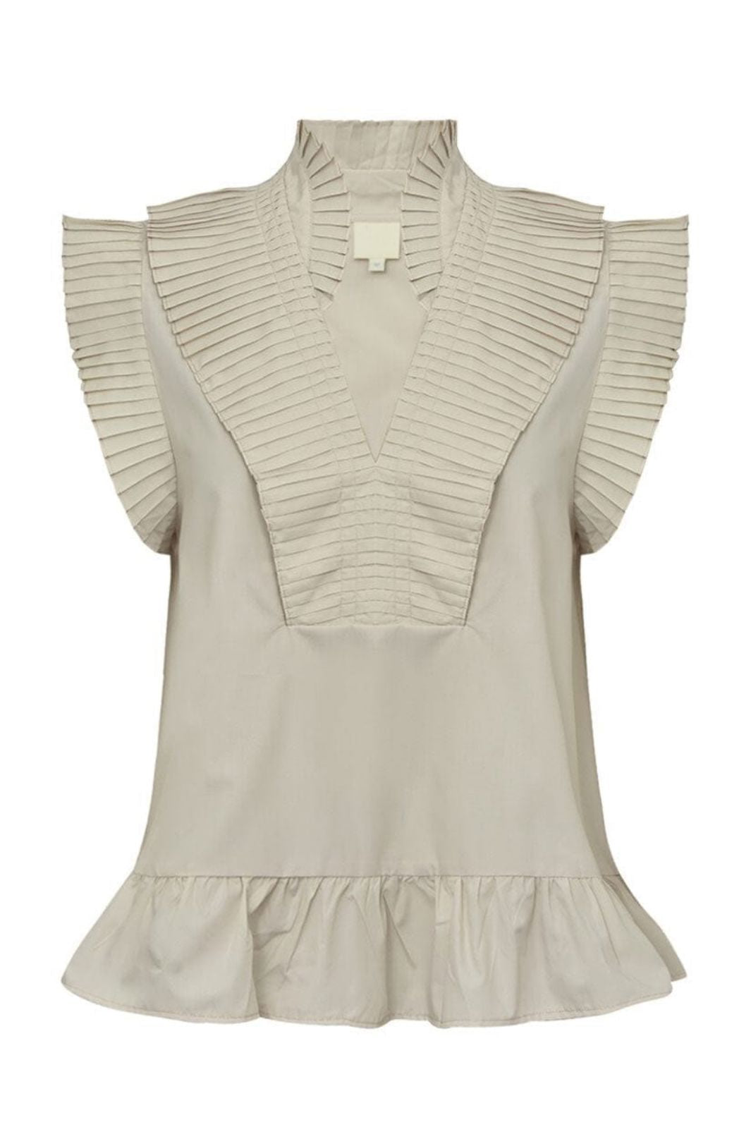 Cremefarvet top fra Gossia med A-facon og dyb V-udskæring. Toppen har plisserede flæser ved kraven, halsen og ærmegabet, der skaber en fin struktur.