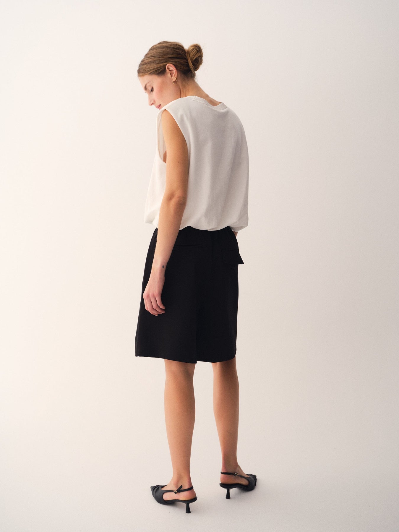 Sorte shorts fra Gossia med plisseret front og logo på taljen. Shortsene har en klassisk lårkort længde og en ensfarvet sort overflade.