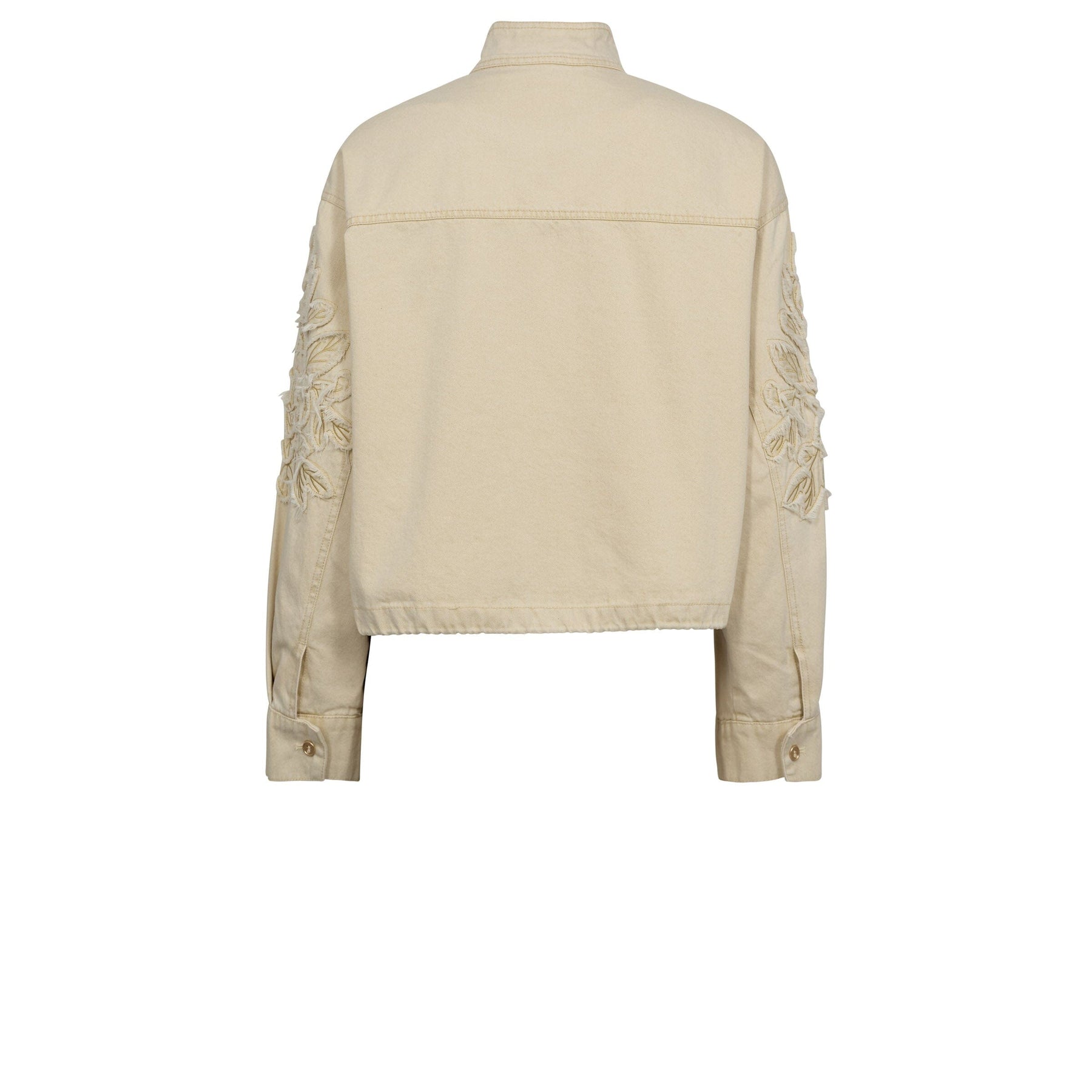 Lys gul jakke fra Gossia i bomuldsmateriale. Jakken har broderede mønstre på ærmerne og praktiske detaljer som frontlynlås og lommer på forsiden.