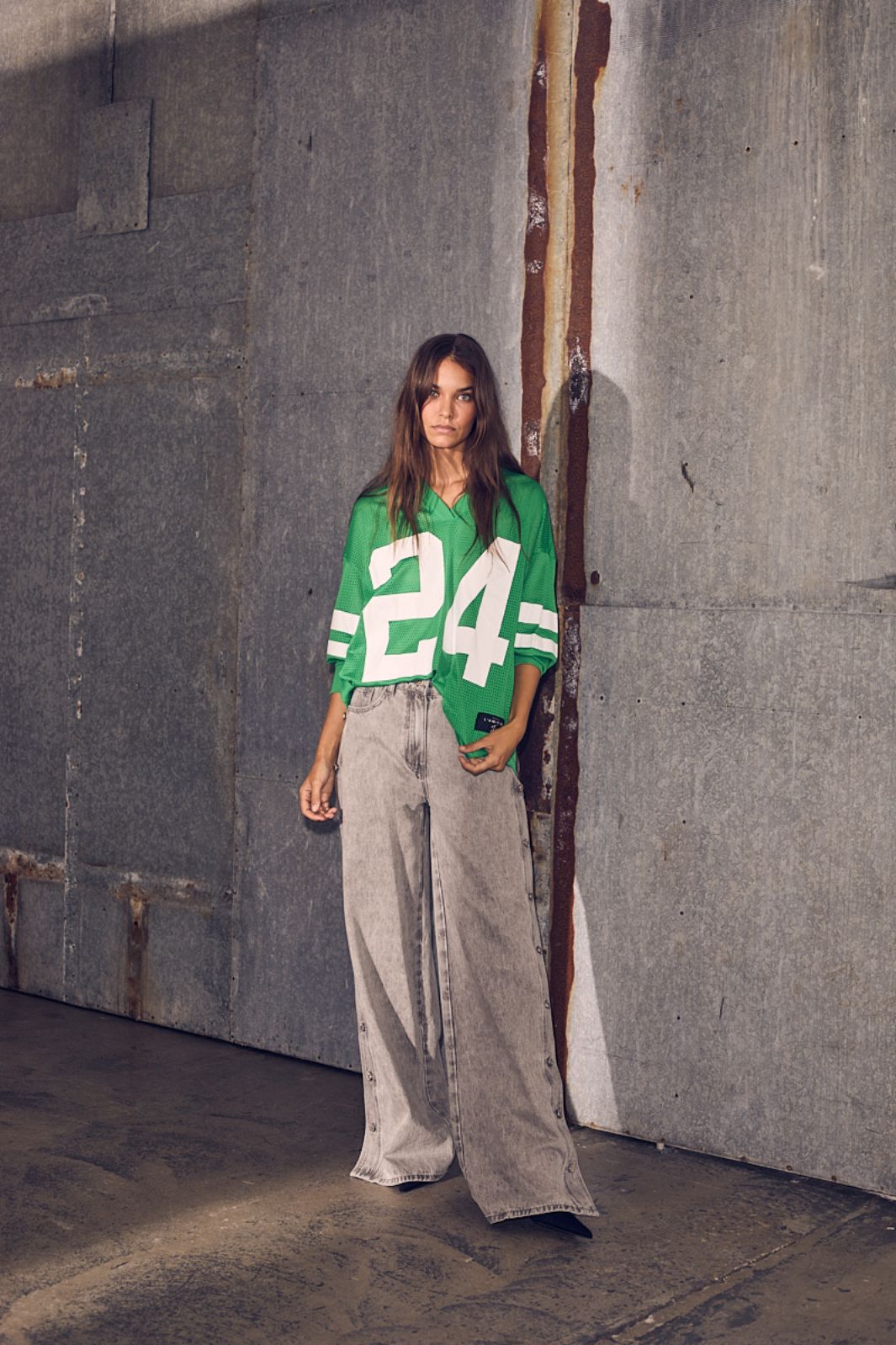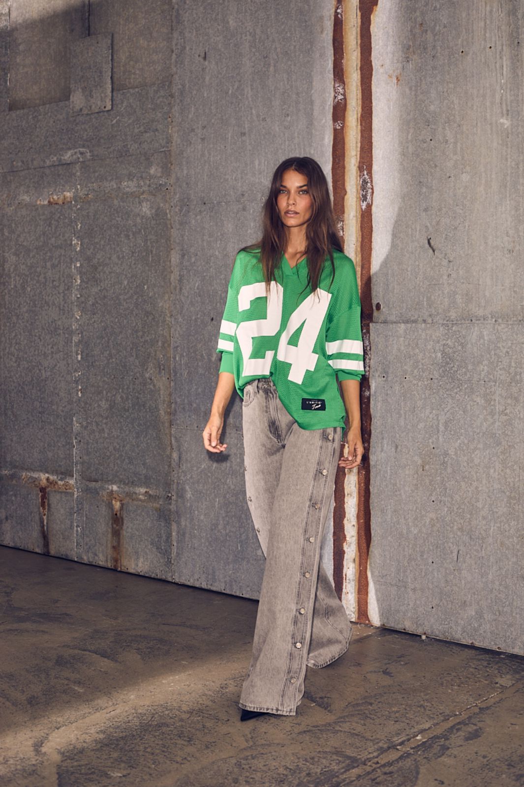 Grøn langærmet t-shirt fra Haute L'Amitié med mesh-design. T-shirten har en oversized pasform og et stort nummer 24 på forsiden sammen med hvide striber på ærmerne.