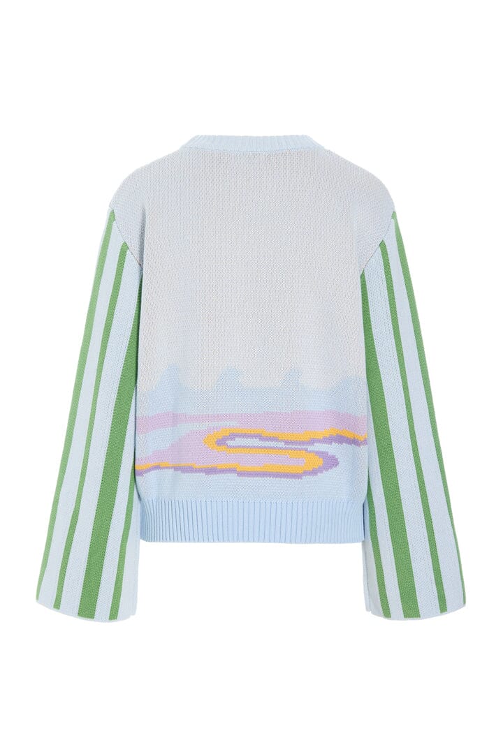 Bluse fra Hunkøn i farven Blue Sea. Den har et broderet motiv med sol og båd på forsiden og vertikale striber på ærmerne.