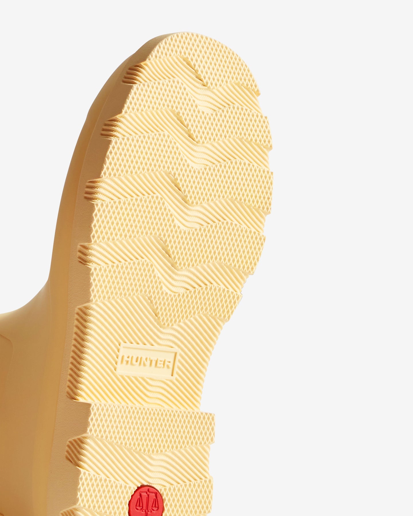 Korte gummistøvler fra Hunter, lavet af 100 % gummi i en lys gul farve. Støvlerne har et enkelt design med det synlige Hunter-logo på forsiden.