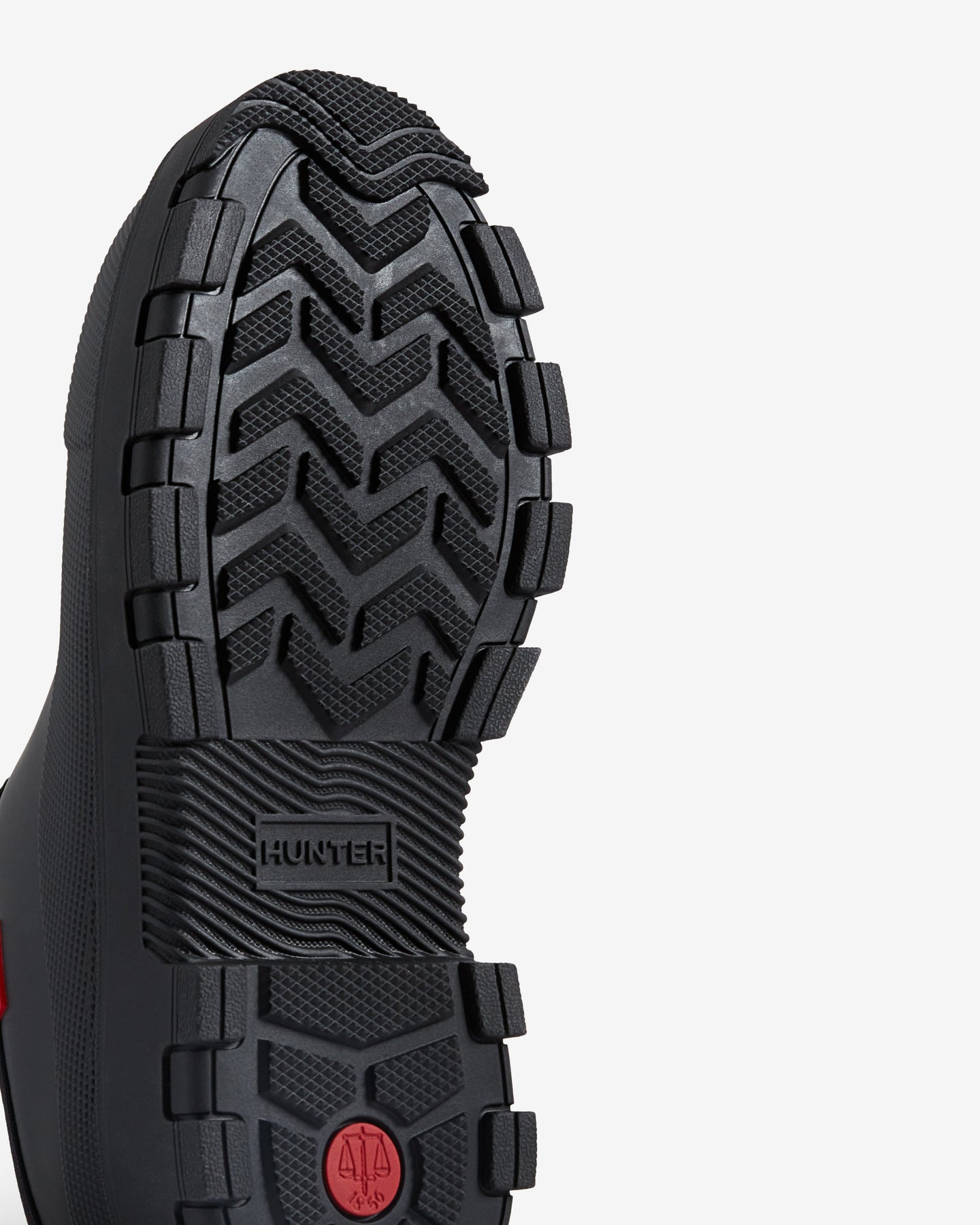 Sorte clogs fra Hunter, lavet af støbt gummi. Clogsen har en glat overflade og en robust sål med dybt mønster.