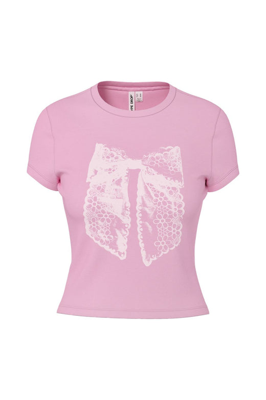 Pink cropped t-shirt fra Hypedrop med hvidt sløjfe- og blomsterprint på forsiden. T-shirten har korte ærmer og en rund halsudskæring.
