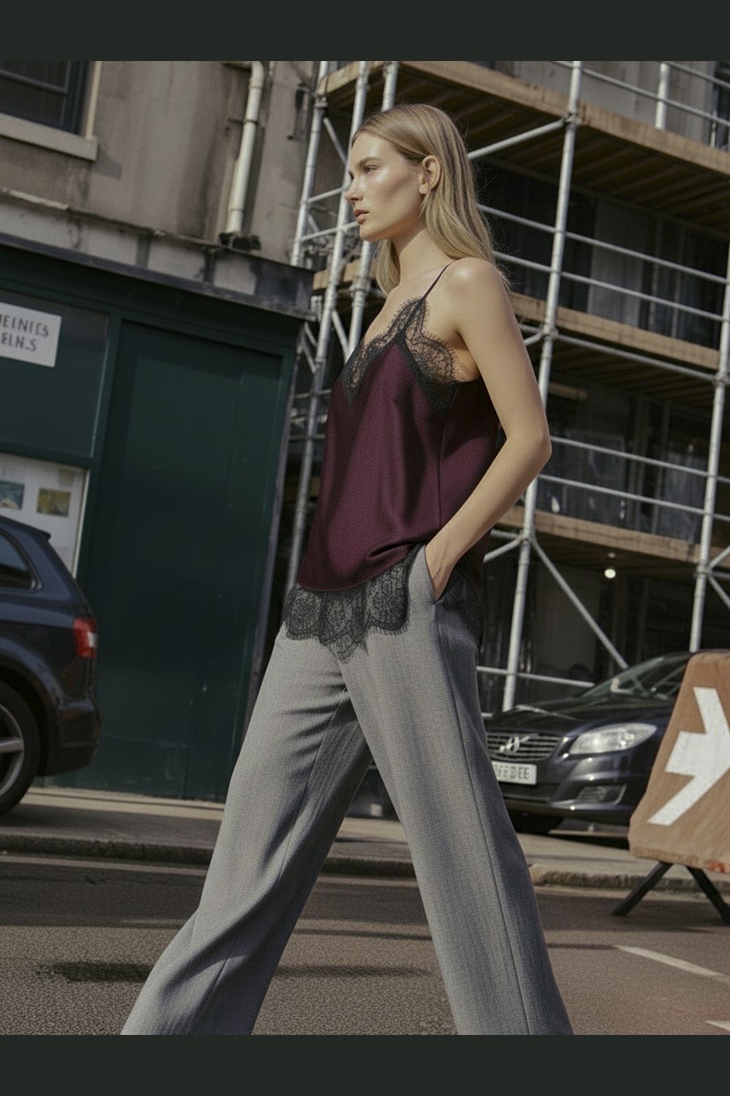 Satin top fra Hypedrop i dyb lilla. Toppen har en V-udskæring med sort blondekant og tynde stropper. Den løse pasform giver god bevægelsesfrihed.
