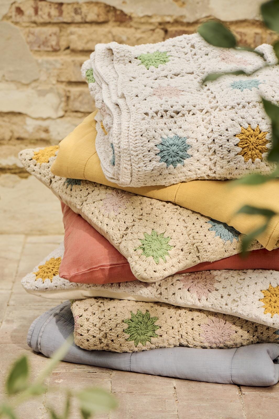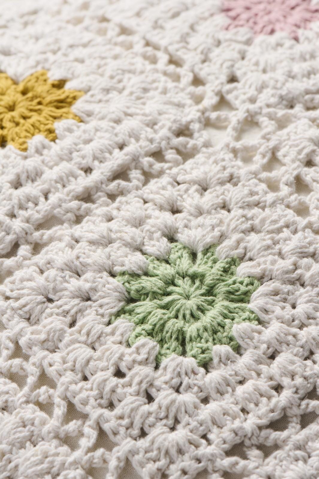 Håndhæklet pudebetræk i bomuld med blomstermønster og lærredsbagstykke. Et charmerende indslag i indretningen, der tilfører tekstur, farve og et strejf af vintage til hjemmet.