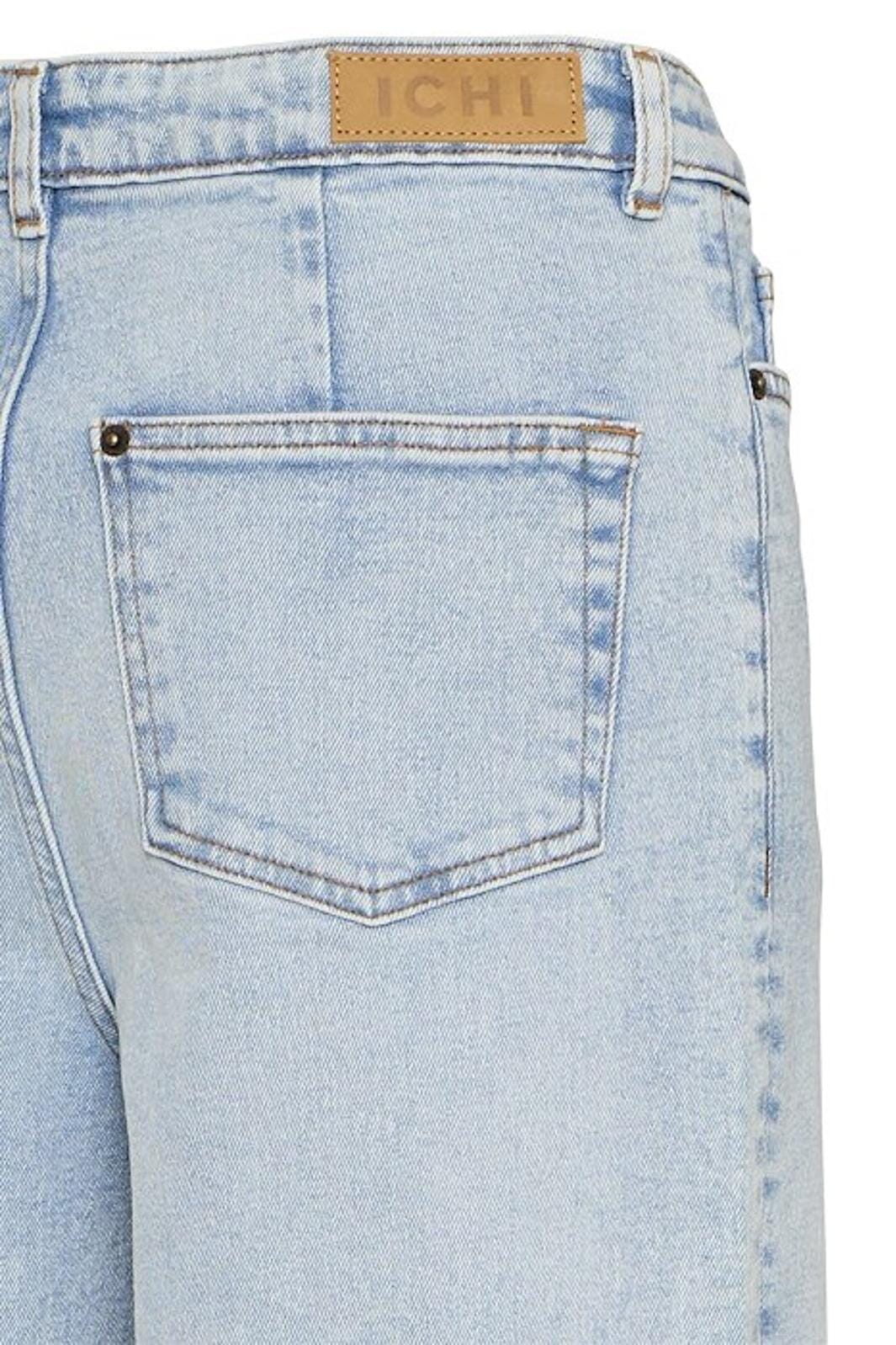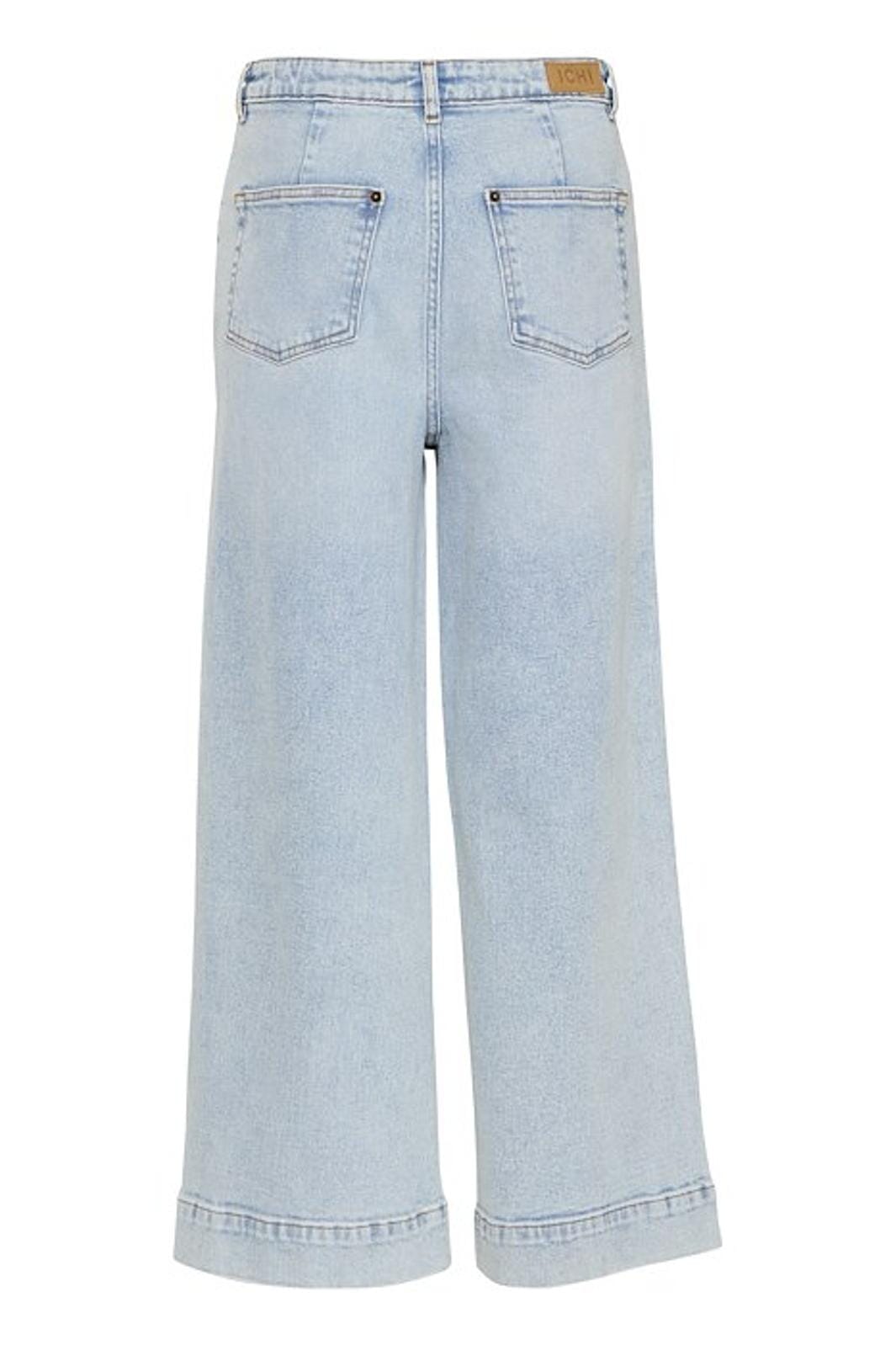 Lyseblå jeans fra Ichi med brede ben og ankellængde. Bukserne har en høj talje og er lavet i en lys, vasket denim, der giver et afslappet udtryk.