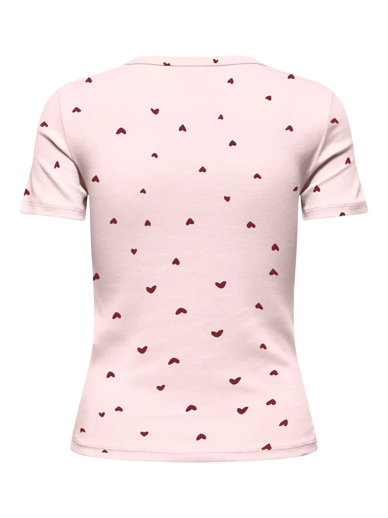 Pink t-shirt fra JDY med små, røde hjerter over hele stoffet. Toppen har en rund halsudskæring og korte ærmer.