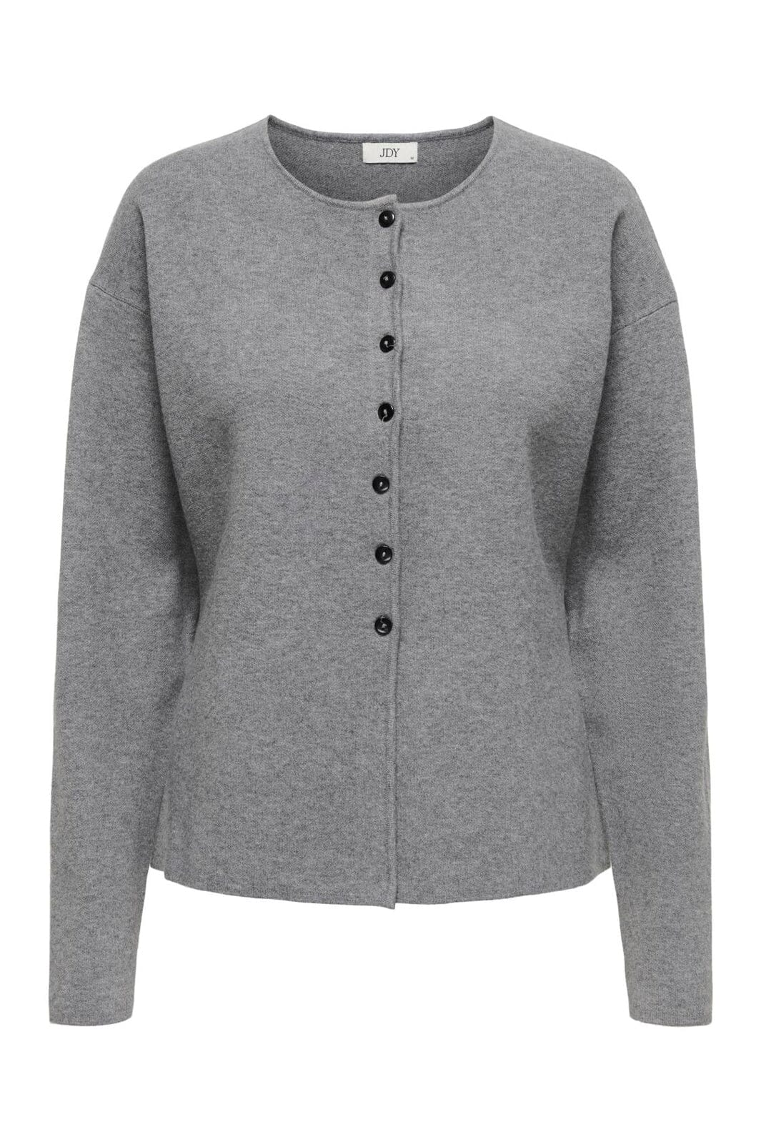 Grå cardigan fra JDY med sorte knapper og rund halsudskæring. Strikket i en blød blanding af genanvendt polyester og viskose, der giver en god komfort i hverdagen.