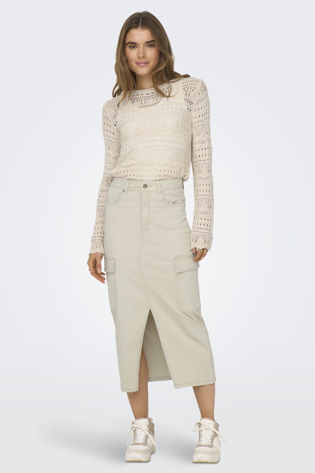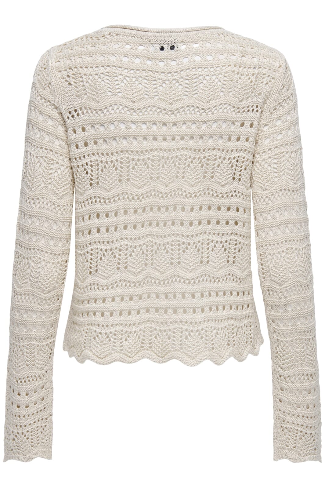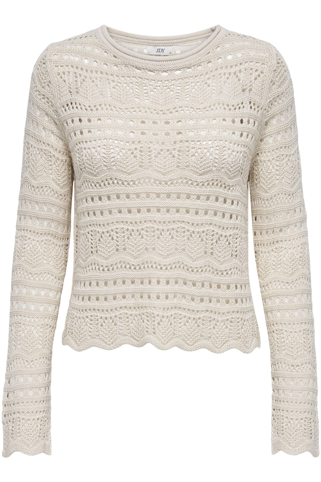 Striktrøje fra JDY i en lys tapiocafarve. Trøjen har strukturstrik og muslingedetaljer gennem hele designet, der skaber et fint mønster i strikken.
