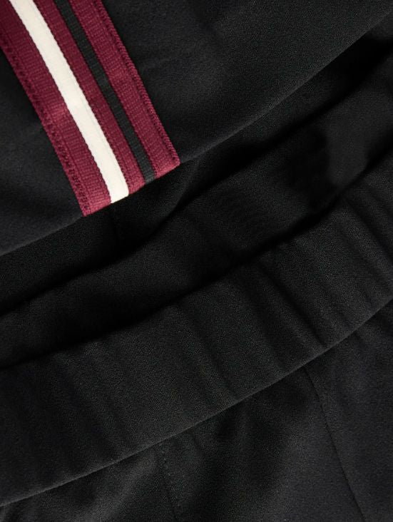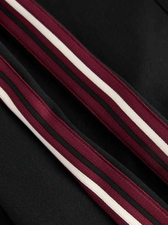 Sorte bukser fra Jjxx med brede ben og striber langs siderne i bordeaux og hvid. Bukserne har høj talje med elastik og snøre i linningen.