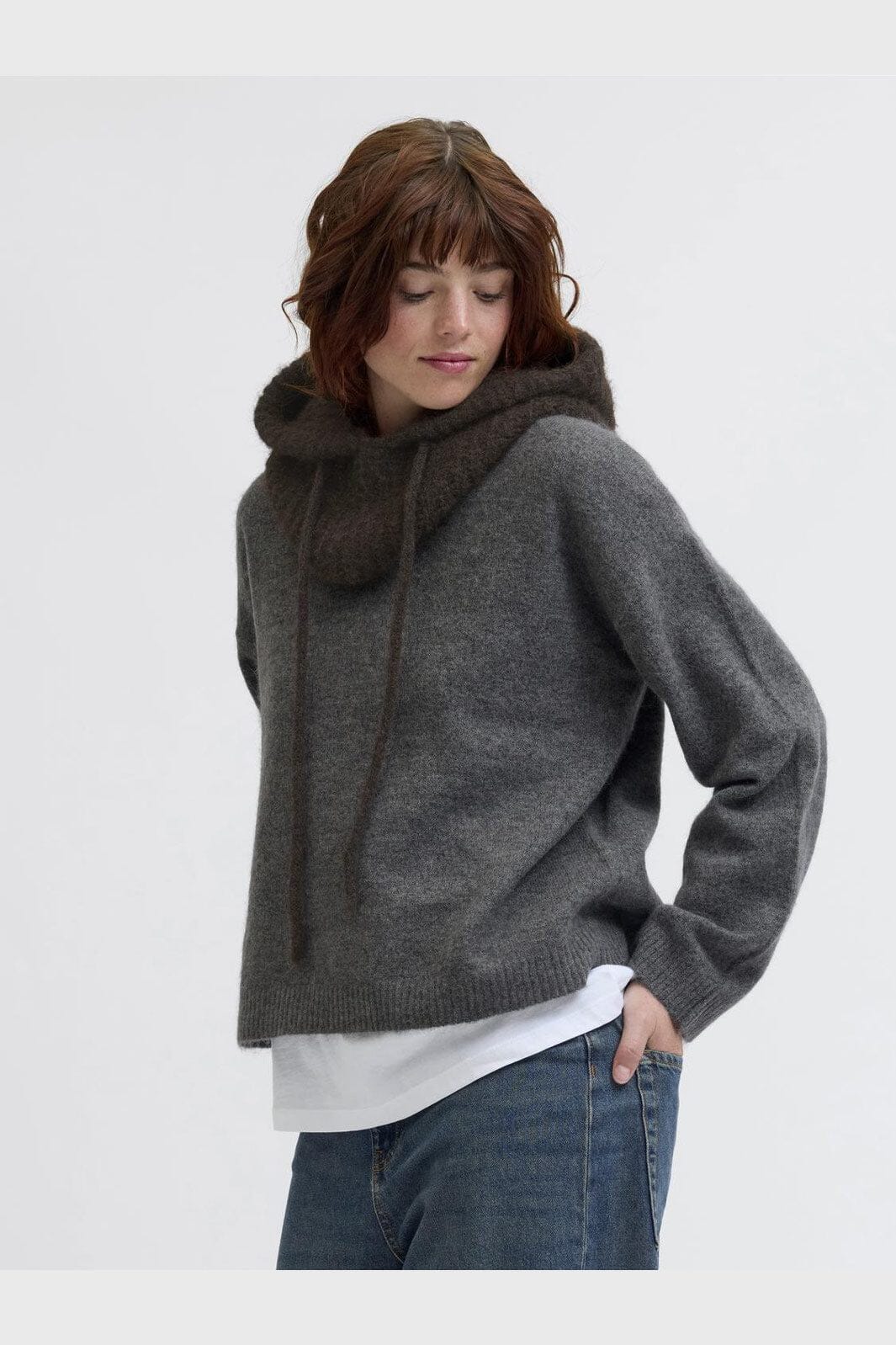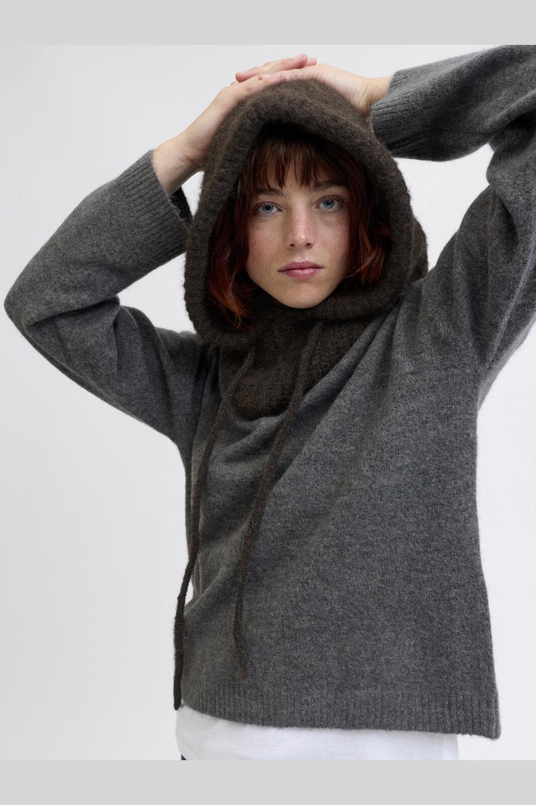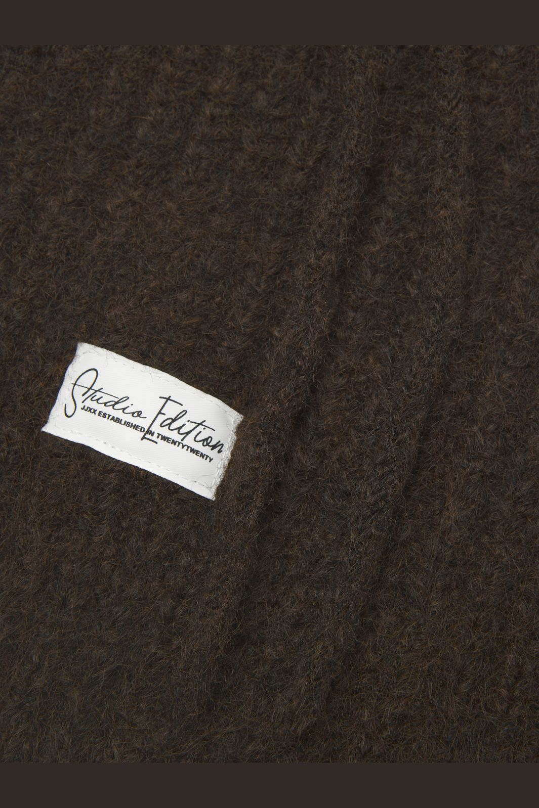 Brun balaclava fra JJXX i fladstrik med snørelukning. Den har en badge-detalje og er fremstillet af en blanding af genanvendt polyester og uld, der giver varme på kolde dage.