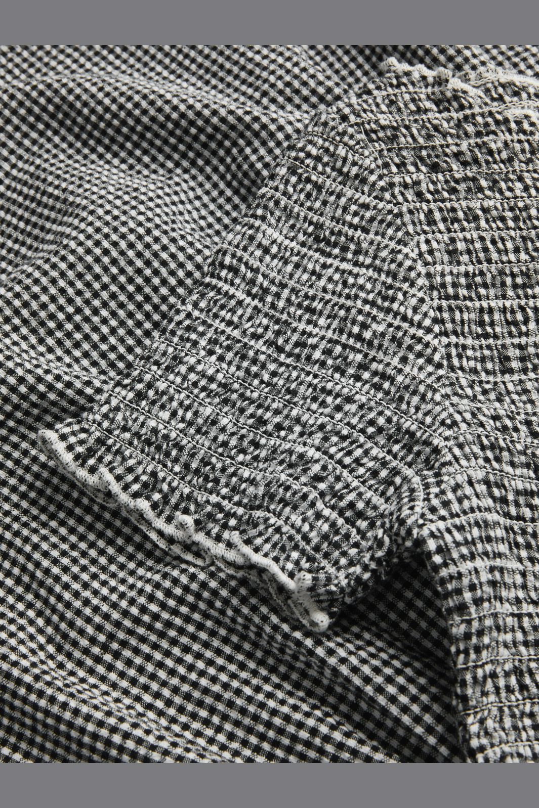 Sort og hvid ternet kjole fra Jjxx med seersucker-stof. Kjolen har en tætsiddende overdel med smock-effekt og en rund halsudskæring, der giver en god pasform til overkroppen.