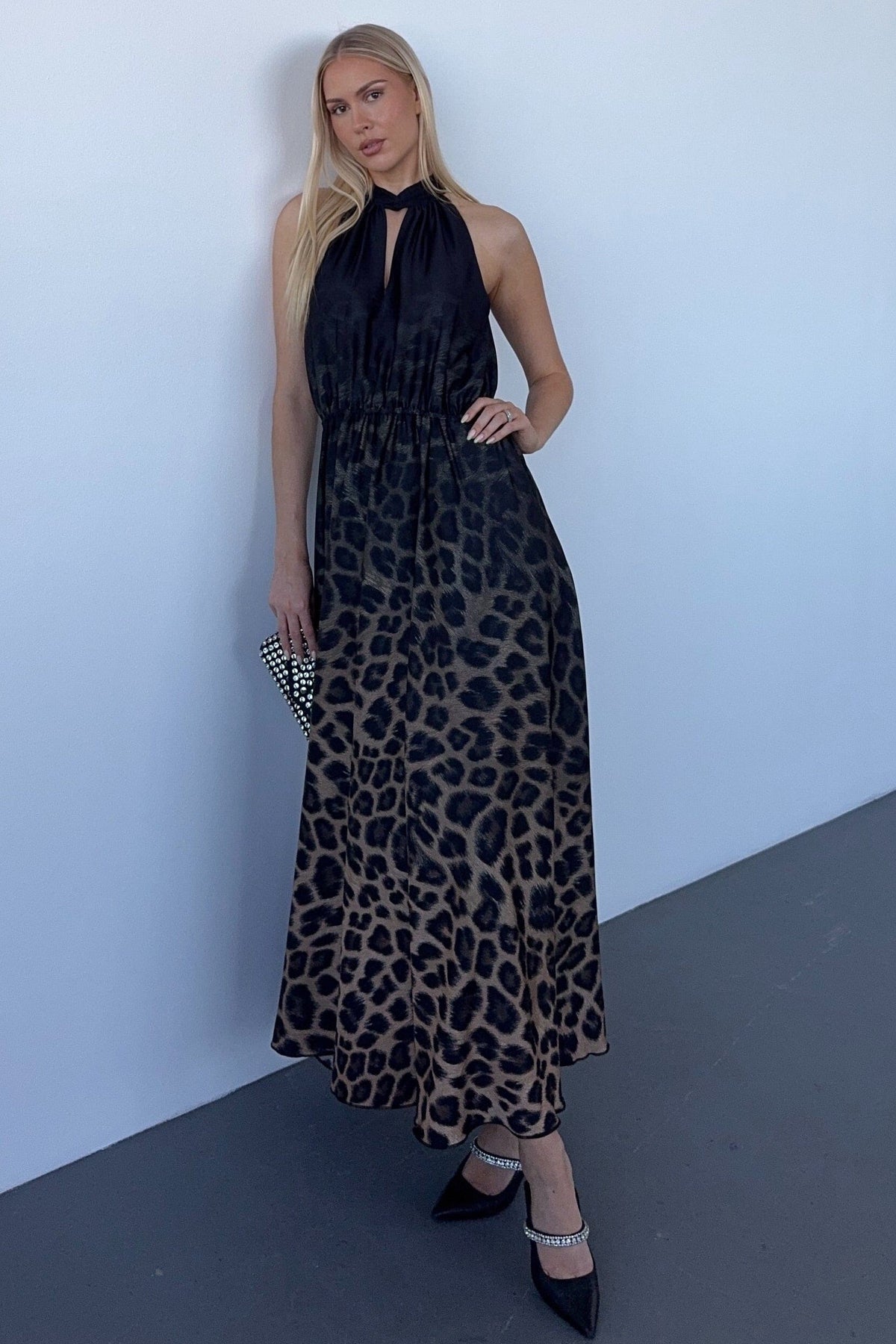 Gulvlang kjole fra Karmamia i sort og beige gradient leopardmønster. Kjolen har en V-udskæring kombineret med halterneck og en elastisk talje, der giver god bevægelighed.