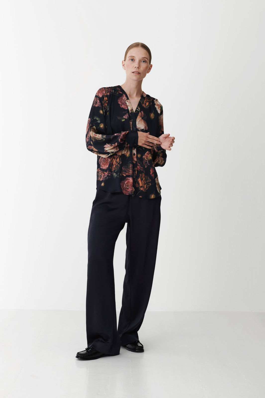 Top med blomsterprint i beige nuancer. Den høje hals har bindebånd bagpå, og det detaljerede blomstermønster viser roser og nelliker i lyse og mørke toner.