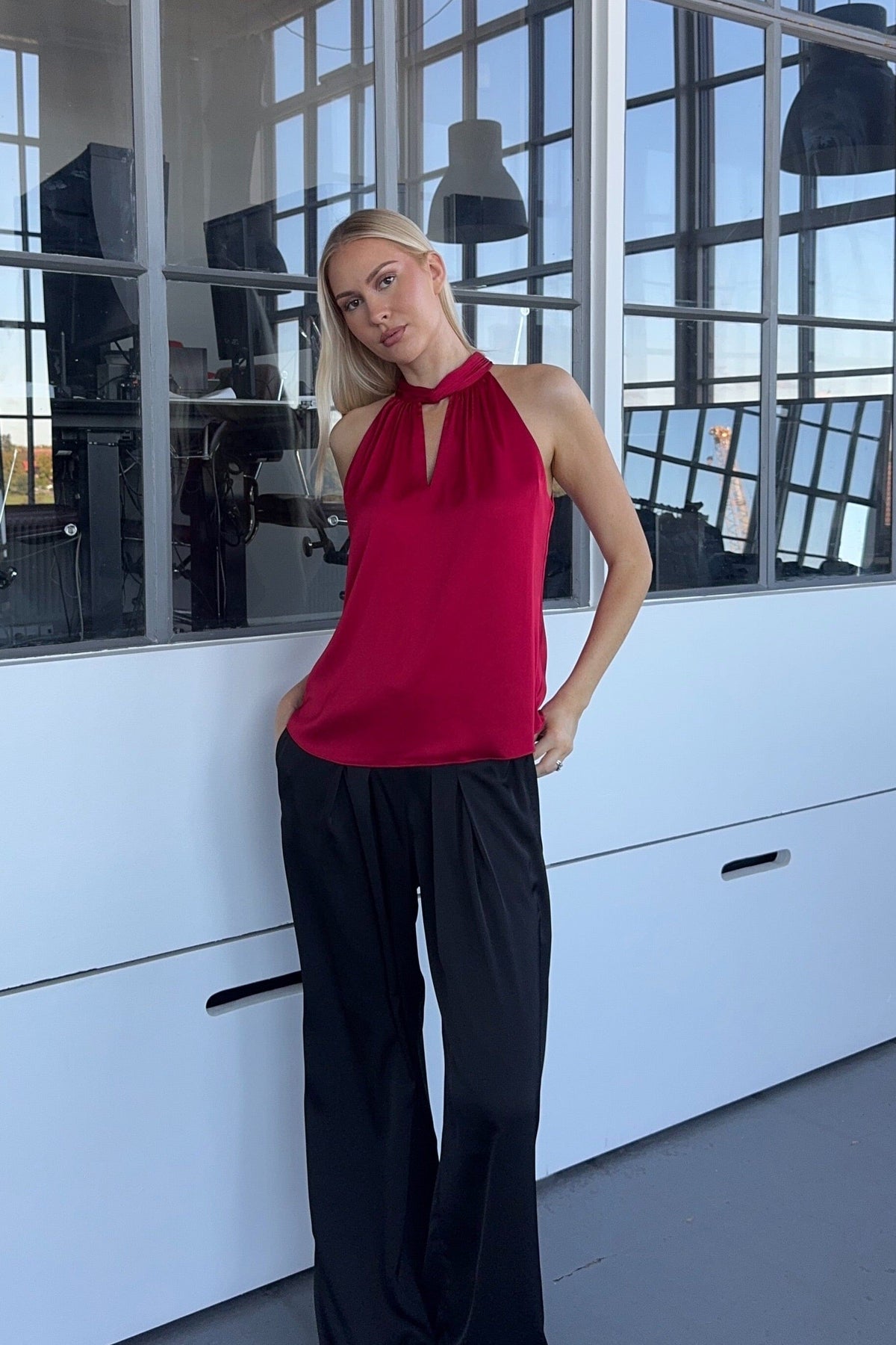 Rød top fra Karmamia med høj hals og flæsedetaljer. Toppen har en dyb V-udskæring og bindebånd ved halsen. Den kan styles med Savannah-nederdelen eller bukser.