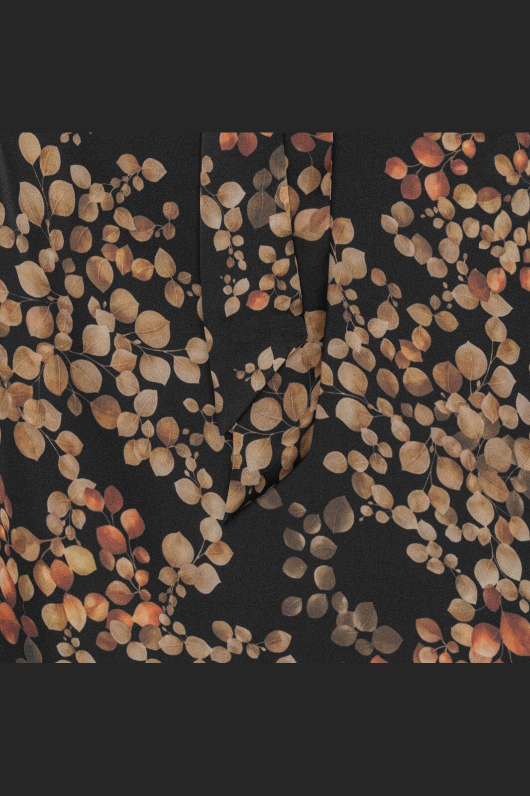 Lang nederdel fra Karmamia med blomsterprint i brune og orange nuancer på sort baggrund. Den har flæsekant forneden og bindebånd i taljen.