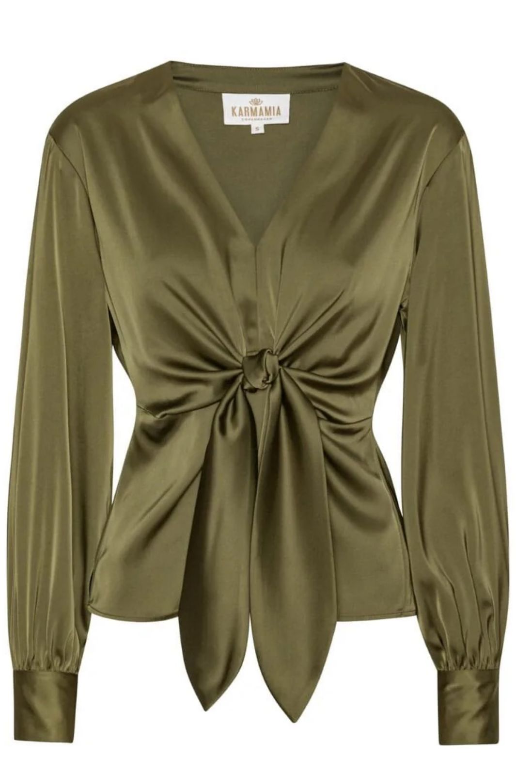 Olivengrøn bluse fra Karmamia med V-hals og knudedetalje foran. Blusen har lange ærmer med pufeffekt ved håndleddene og et blankt, glat stof.
