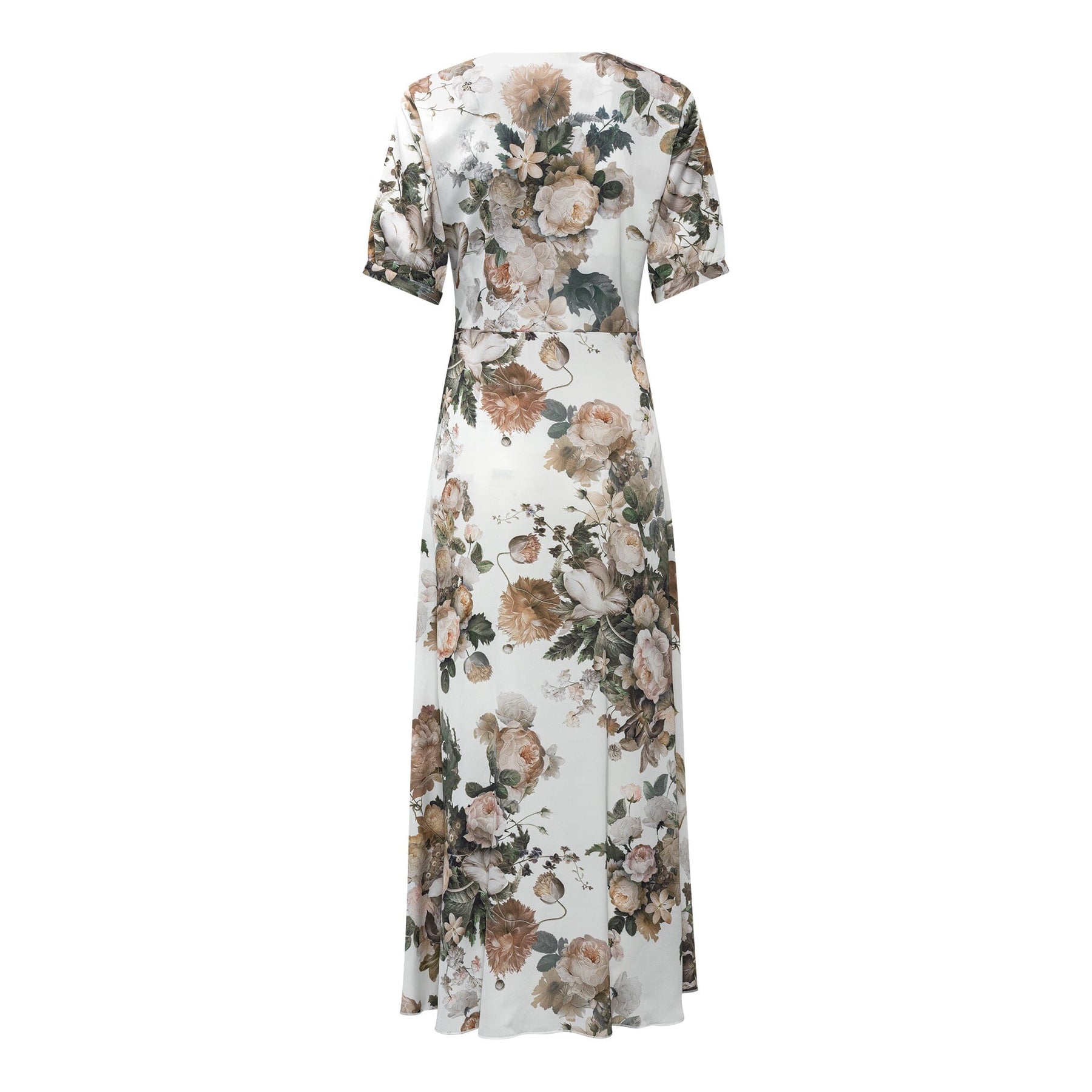 Gulvlang kjole fra Karmamia med blomsterprint på lys baggrund. Kjolen har korte ærmer, V-hals og et bindebånd i taljen.