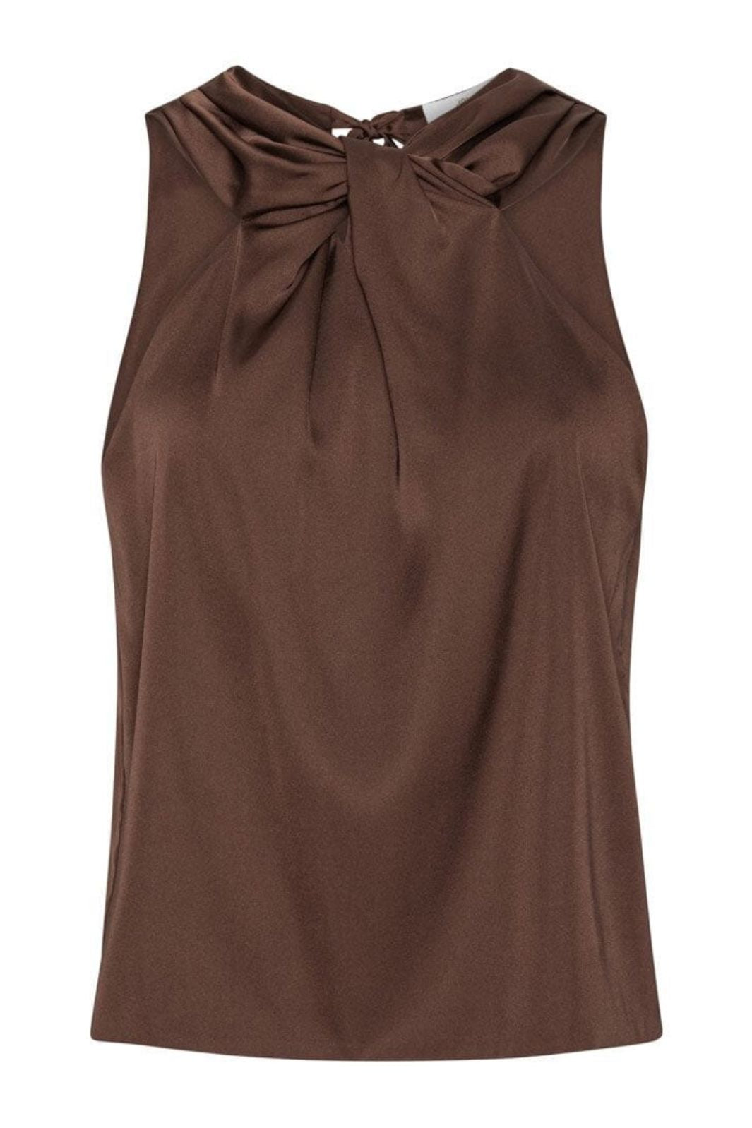 Brun top fra Karmamia med høj hals og knudedetalje. Den ærmeløse model har en regular fit og lukkes med knapper. Toppen passer til både formelle og festlige anledninger.