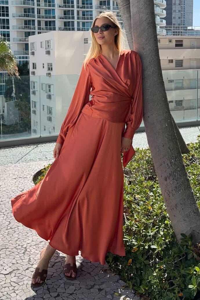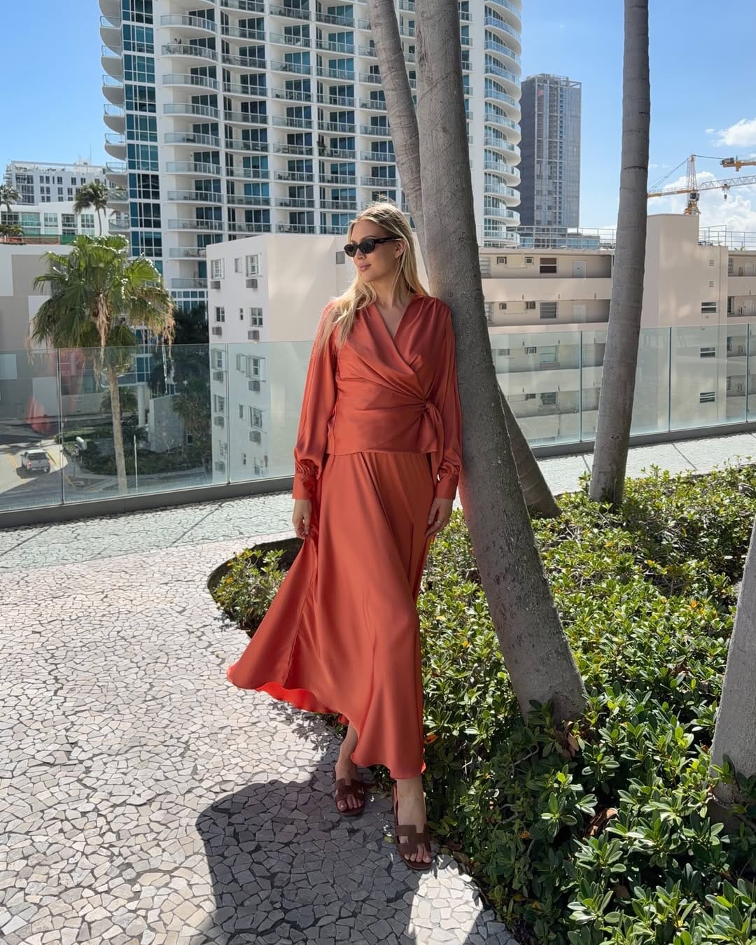 Slå-om-bluse fra Karmamia i en orange nuance. Blusen har en V-udskæring og knudedetalje på siden.