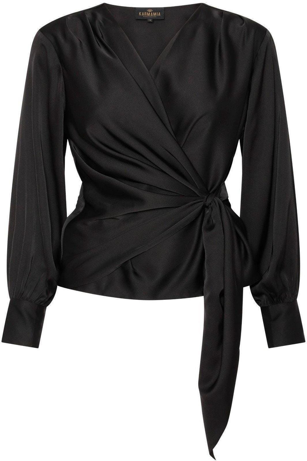 Sort satinbluse med indpakningsdesign og bindebånd i taljen. Den glatte overflade giver blusen et blankt udtryk, og V-udskæringen skaber en fin halsudskæring.