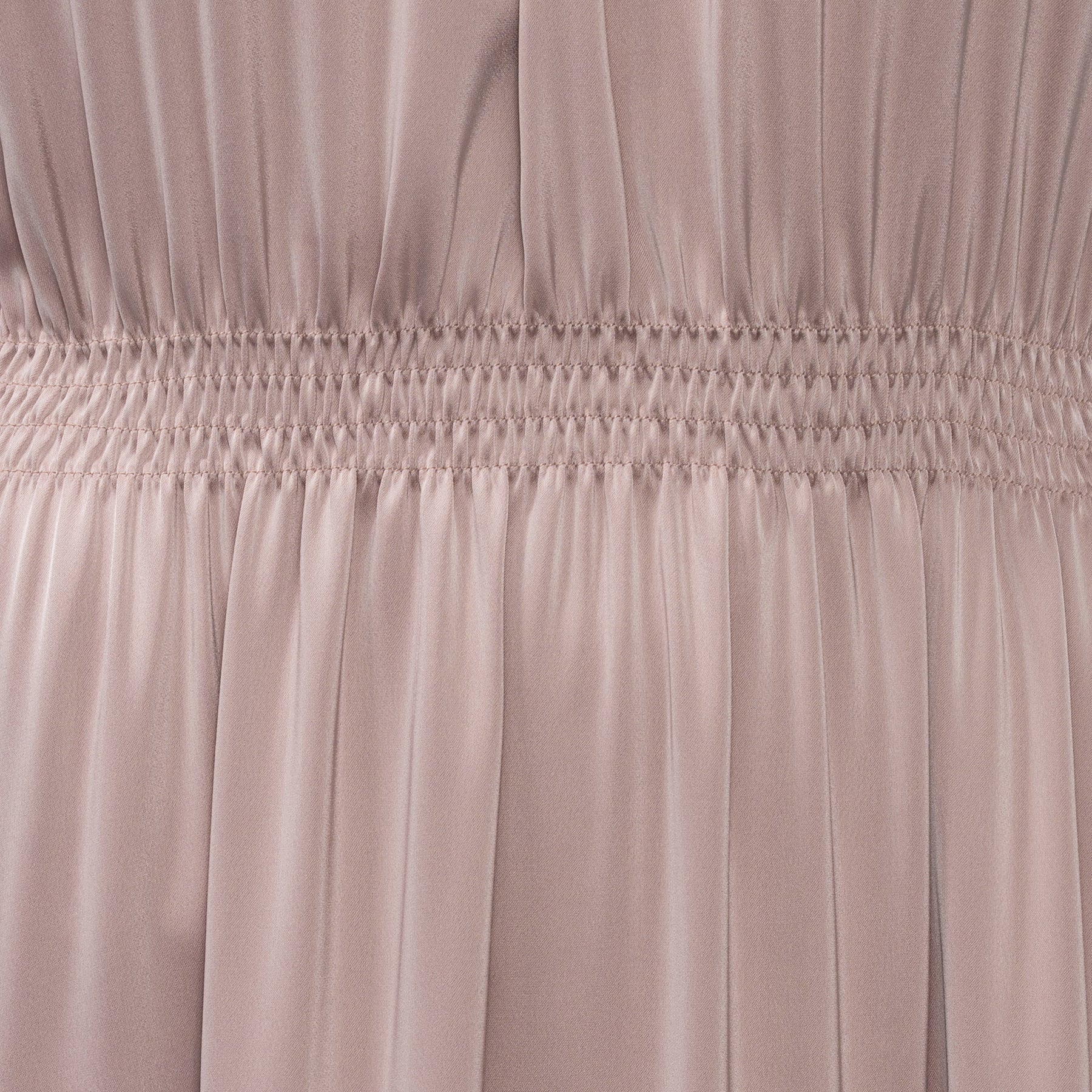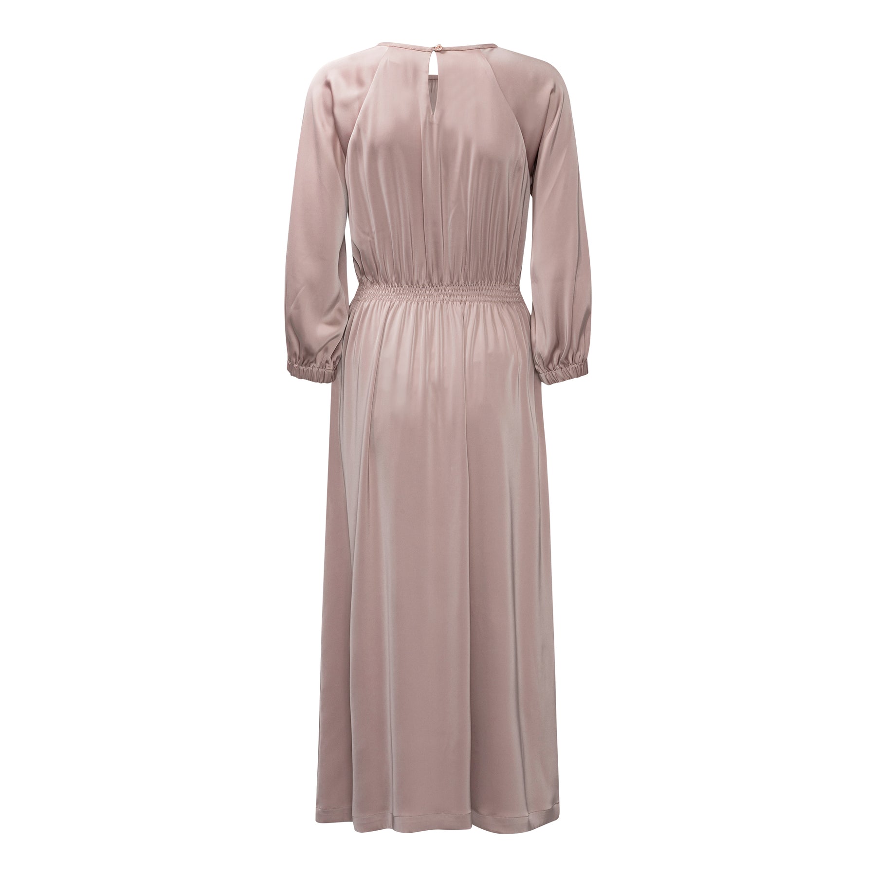 Lyserød kjole fra Karmamia, lavet af satin i en blød rosa nuance. Kjolen har en længde til læggene og 3/4-ærmer.