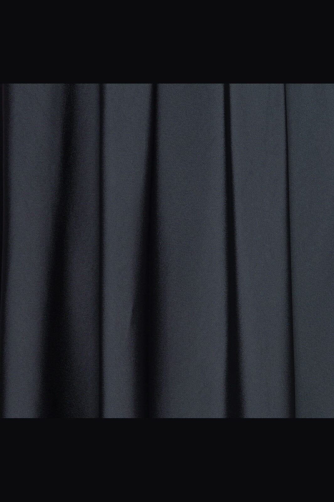 Mørkeblå nederdel fra Karmamia i skinnende satin. Den har høj talje med rynket elastik og falder løst ned til læggene med bløde folder.