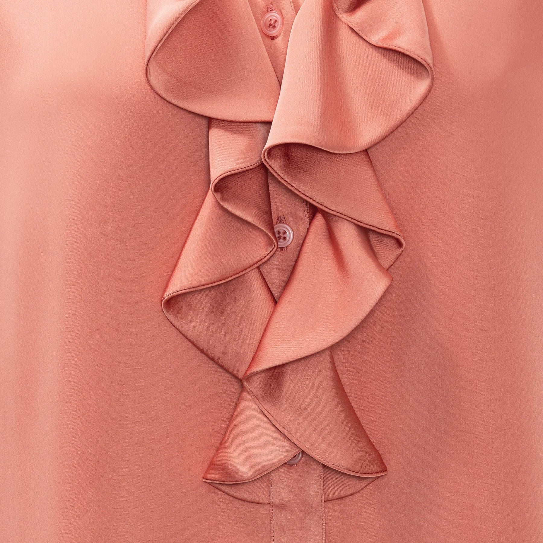 En kortærmet bluse fra Karmamia i en ferskenfarvet nuance. Blusen har V-udskæring, flæsedetaljer foran og knaplukning.