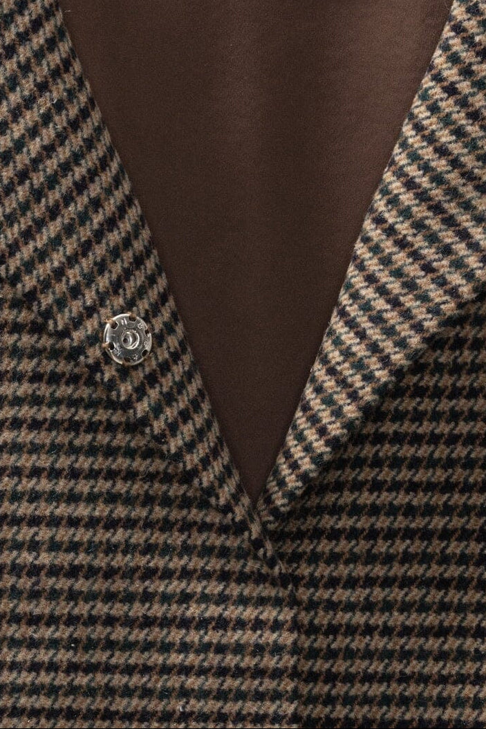 Jakke fra Karmamia med ternet mønster i brune og beige nuancer. Yderlaget er lavet af uld, mens foret er af blød polyestersatin.