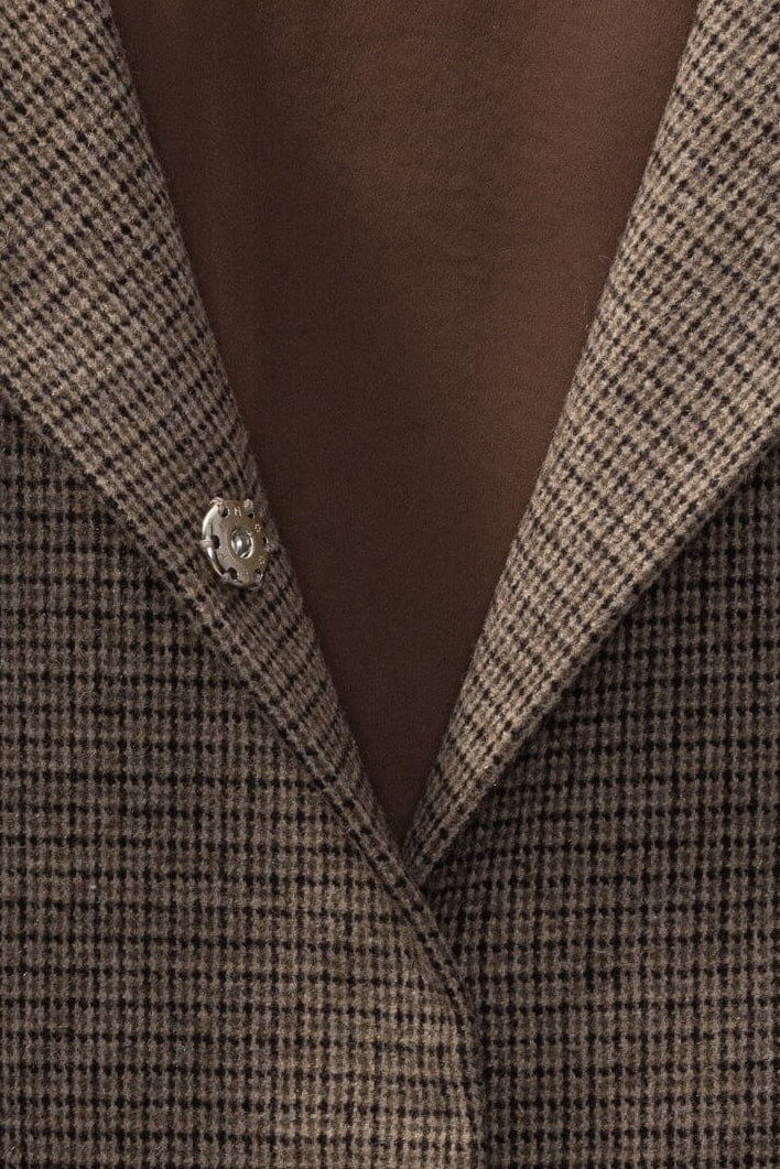 Ternet jakke fra Karmamia i brun nuance. Jakken har peplumærmer med lagdelte flæser og to synlige metalknapper ved halsudskæringen.