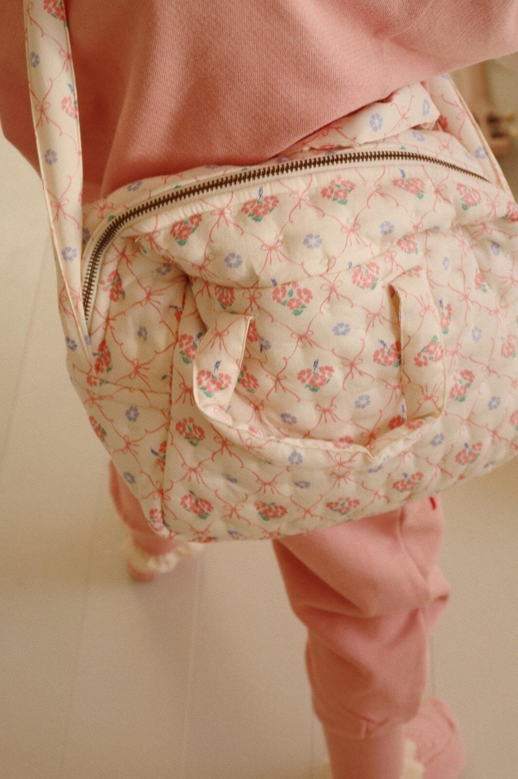 En dukketaske fra Konges Sløjd med quiltet blomstermønster i lyse farver. Den polstrede taske har lynlåslukning og er designet til opbevaring af dukketilbehør.