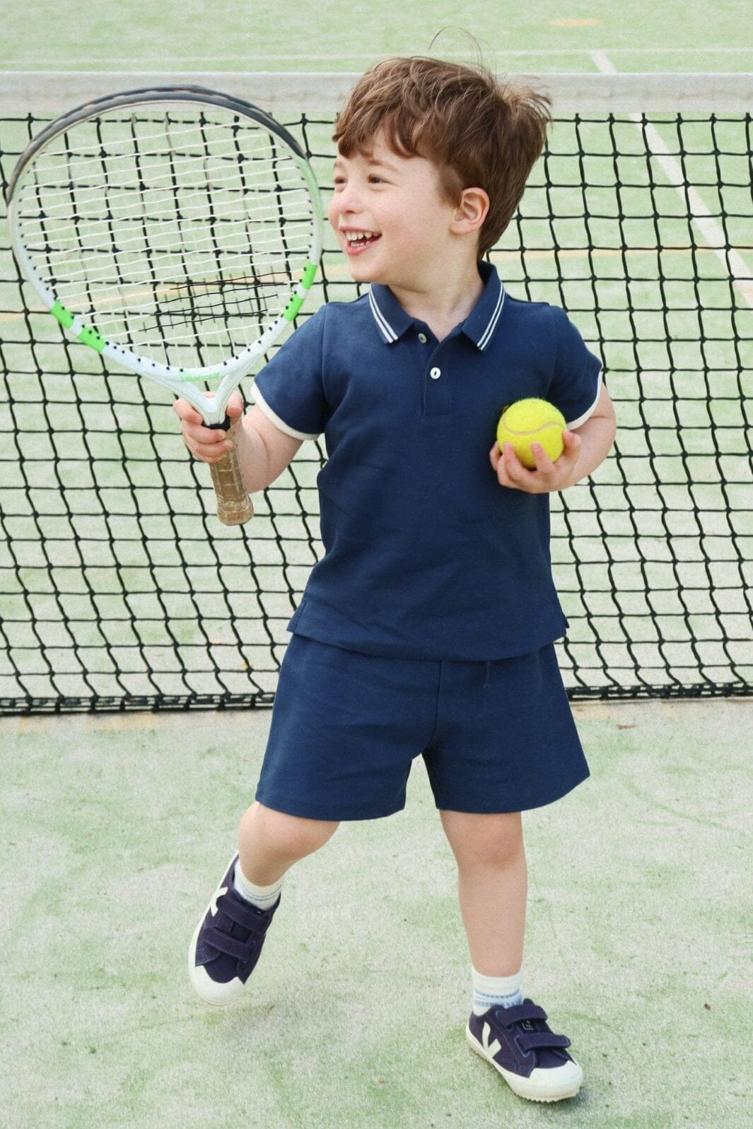 Mørkeblå shorts fra Konges Sløjd, lavet af 100 % økologisk bomuld. Shortsene har en almindelig talje og er lårkorte med elastik og snøre.