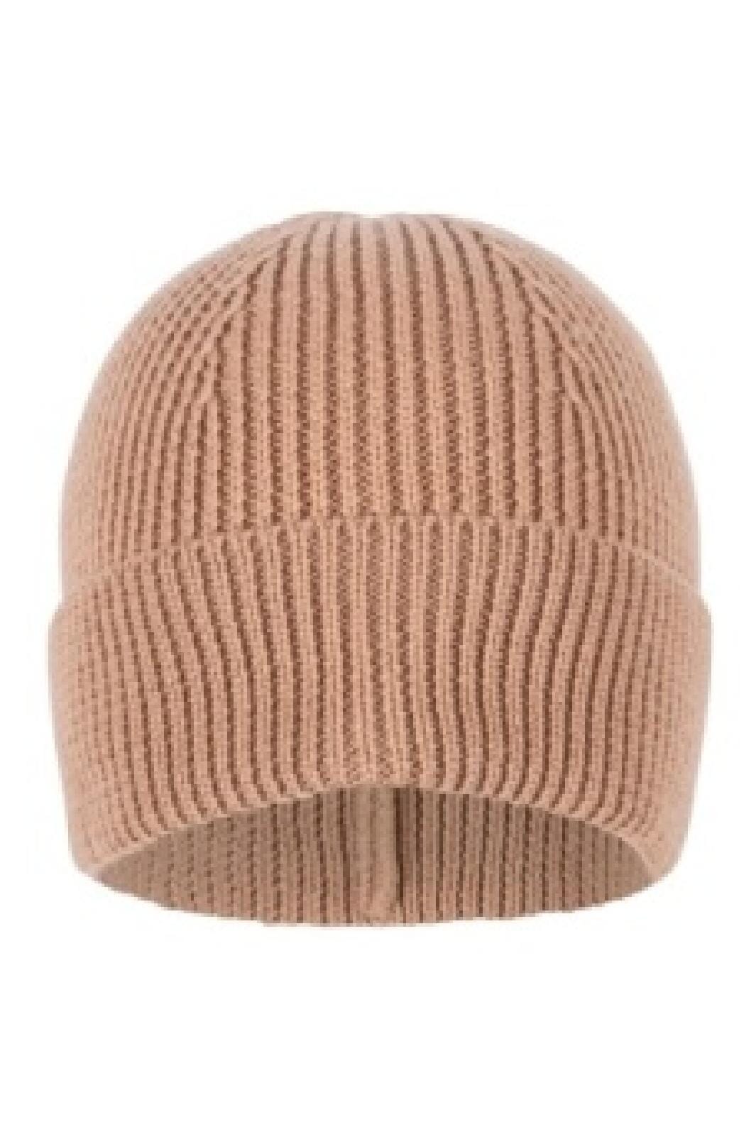 Strikket hue fra Konges Sløjd i en lys brun farve. Huen har en ribbet struktur og en ombukket bund, der giver en god pasform.