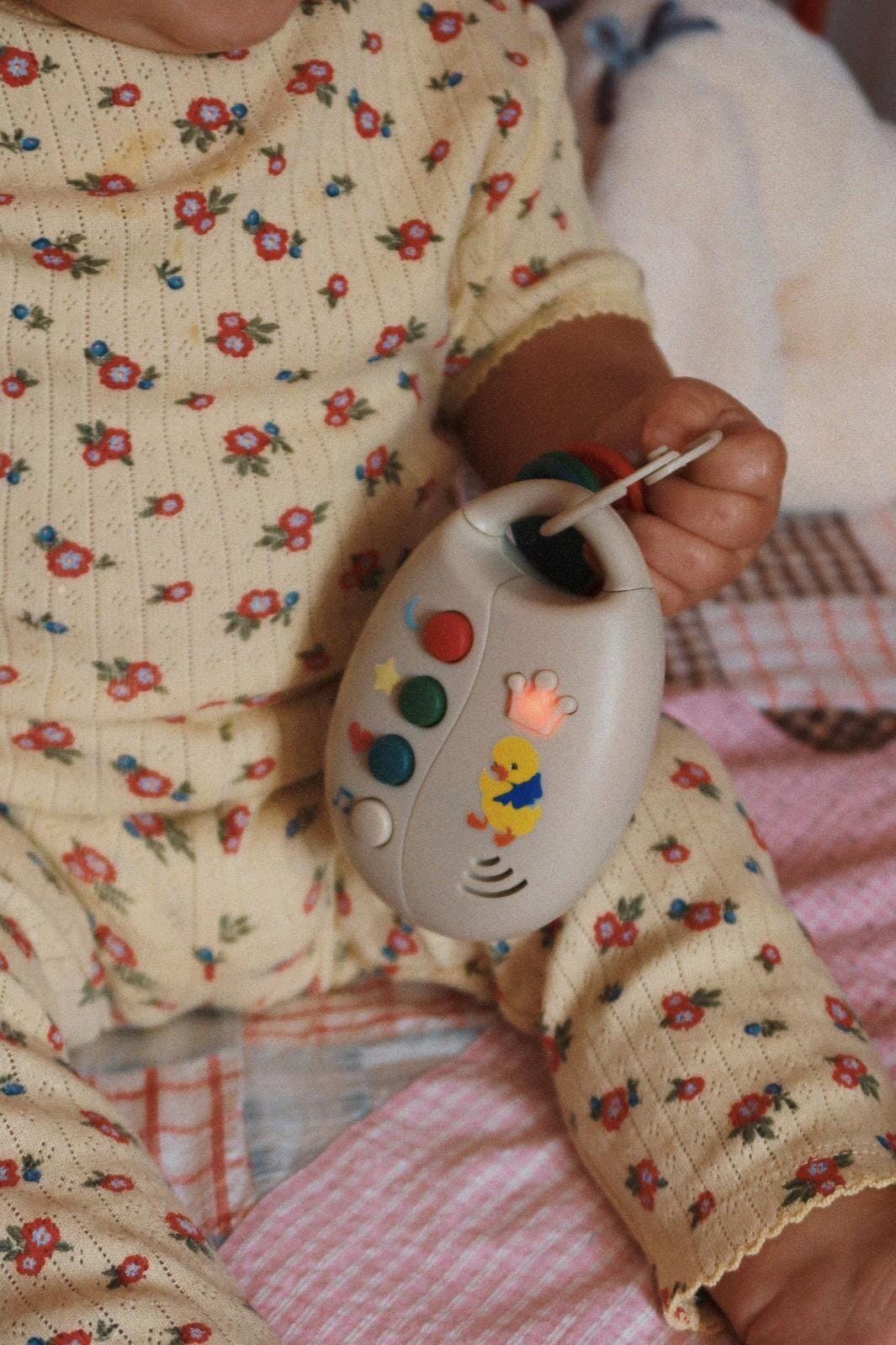 Legetøjsnøgler fra Konges Sløjd med tre nøgler i rød, grøn og blå, fastgjort til en ring. Legetøjet har knapper med symboler som måne, stjerne og hjerte samt illustrationer af en and og en krone.