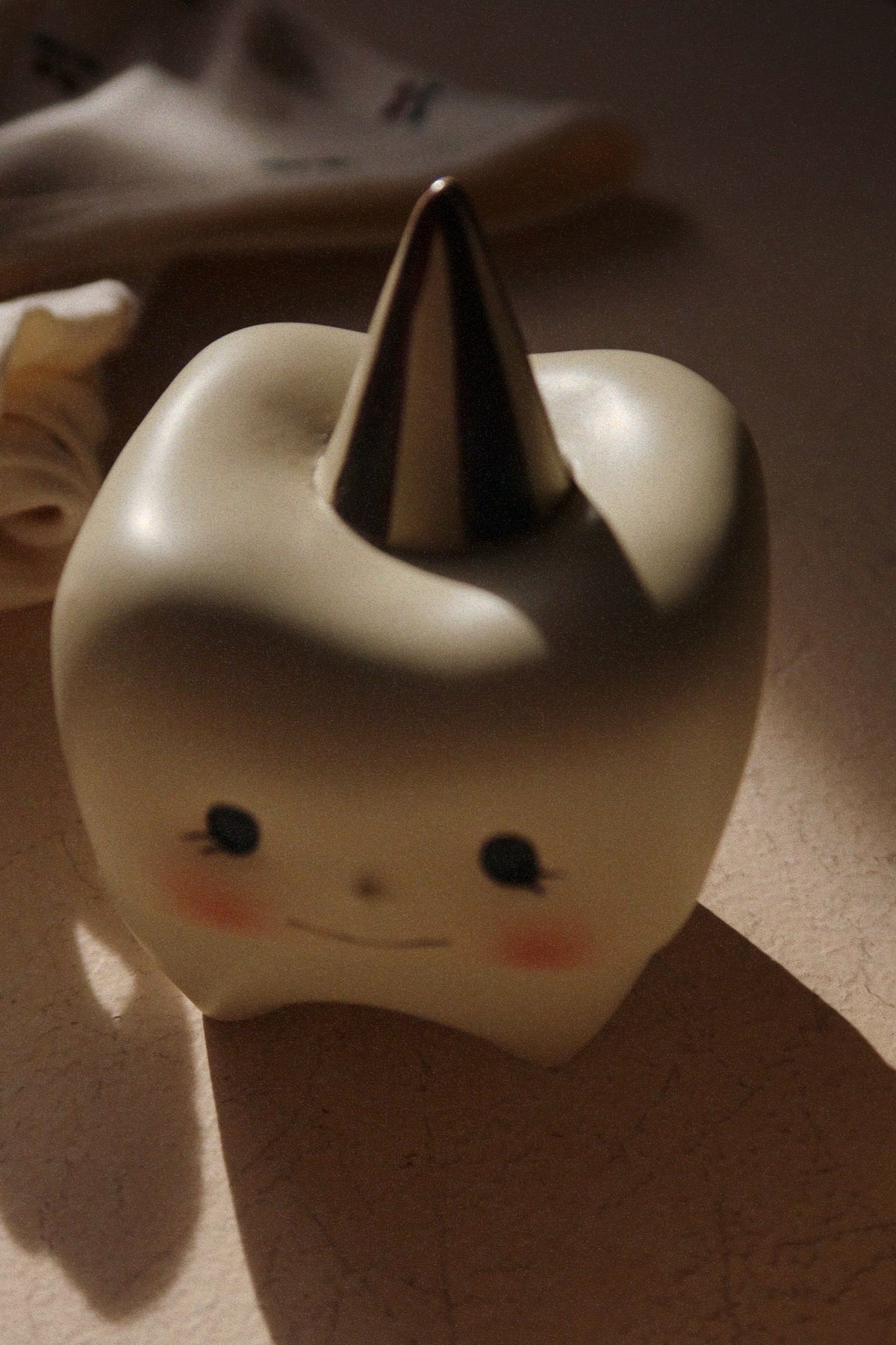 En tandformet opbevaringsboks fra Konges Sløjd med dekorative detaljer. Boksen er formet som en tand og har et ansigt på forsiden.