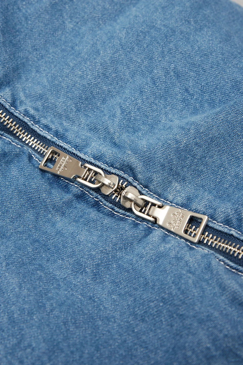 En stor taske fra Lala Berlin, lavet af denim i vasket blå farve. Tasken har en rektangulær form med lange håndtag.