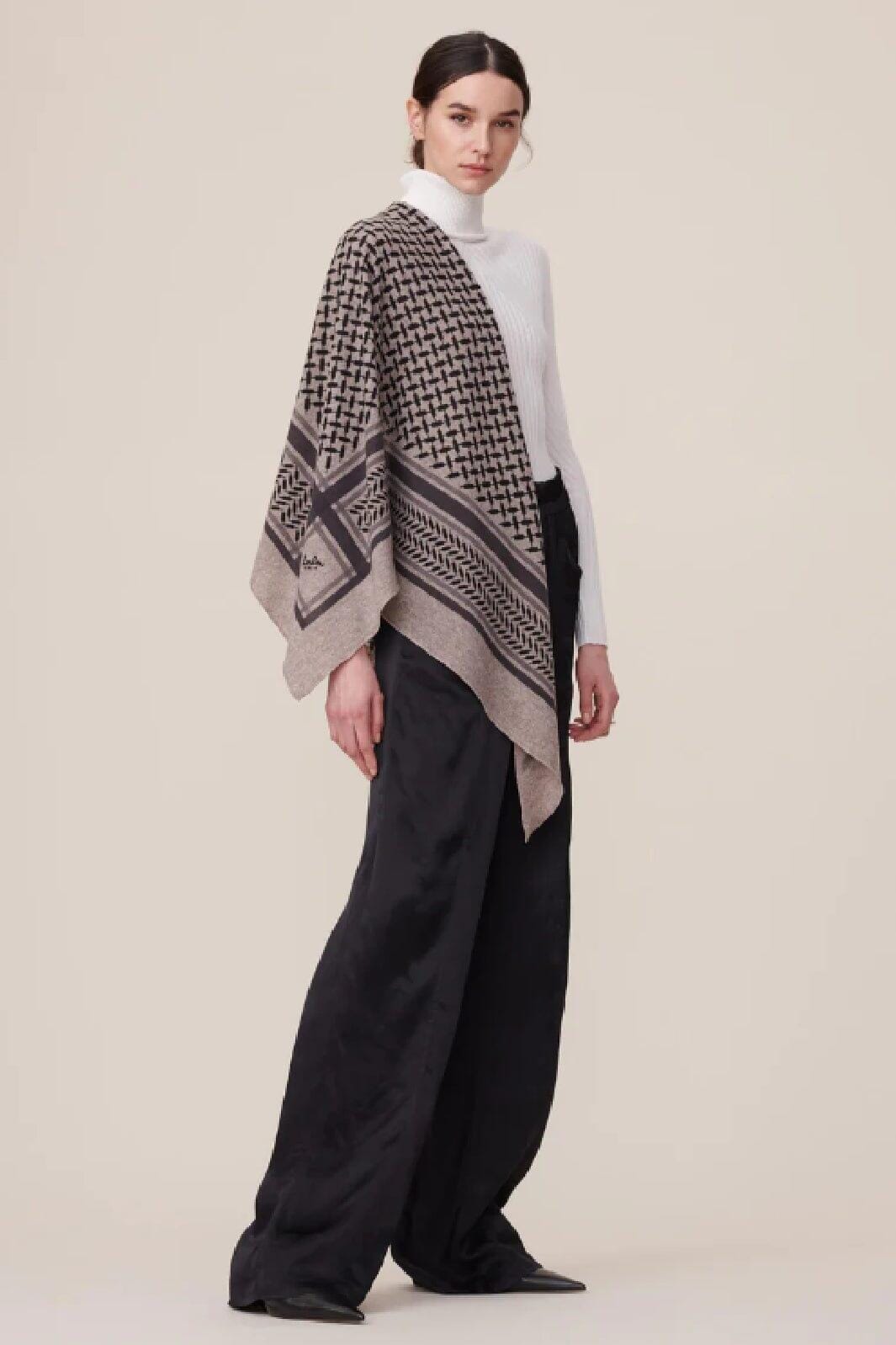 Trekantet tørklæde fra Lala Berlin i brun melange. Et stort tørklæde med det karakteristiske Kufiya-mønster på en brun baggrund. Tørklædet er fremstillet af kashmir.