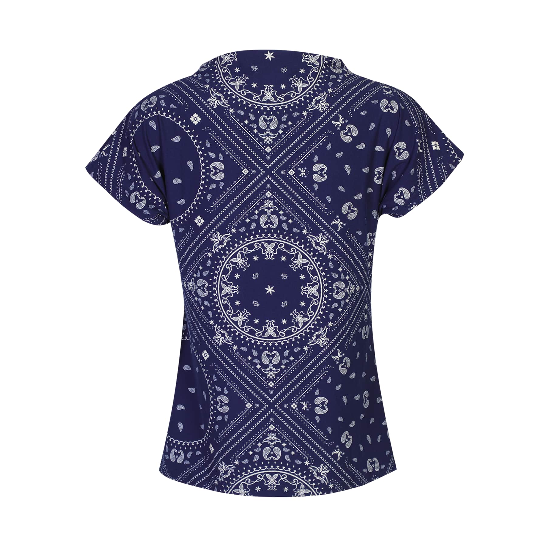 En kortærmet top fra Liberte, lavet i Alma-kvalitet. Den mørkeblå farve har et paisley-mønster med lysere detaljer.