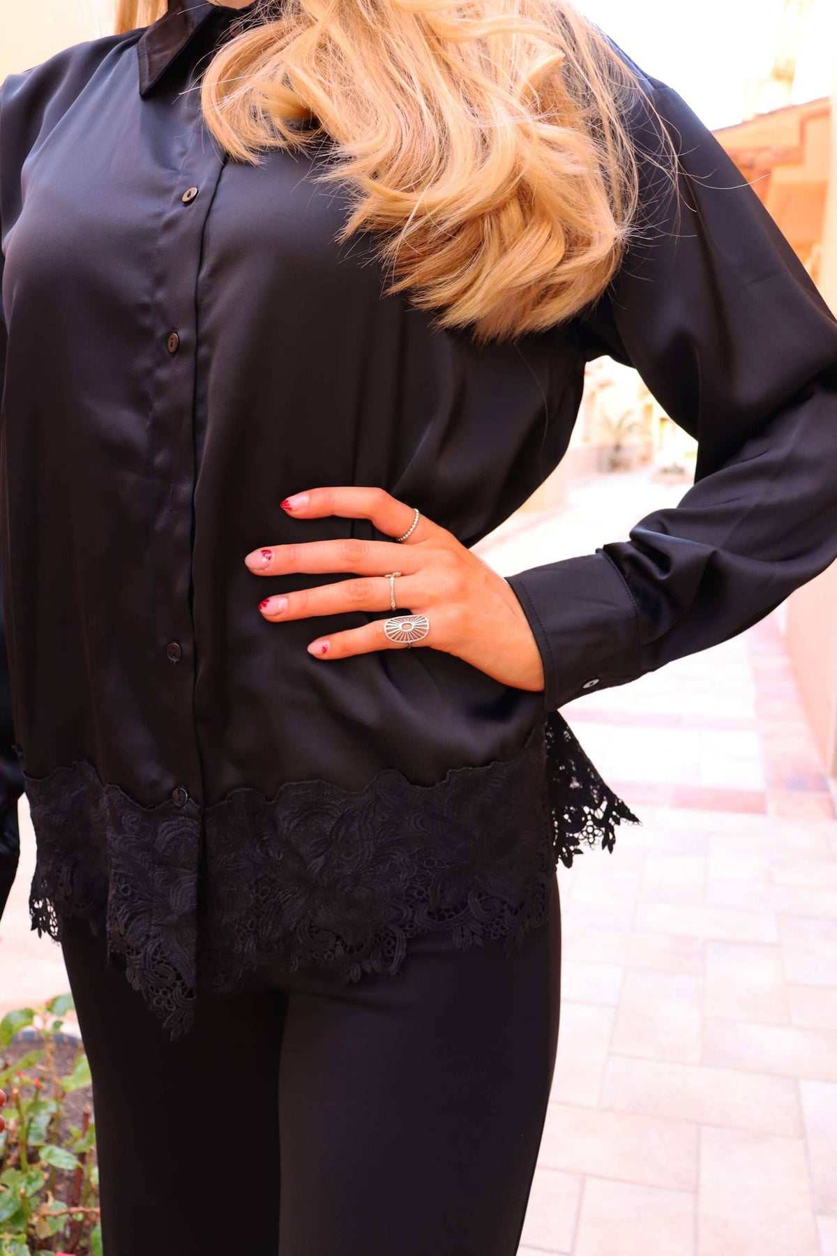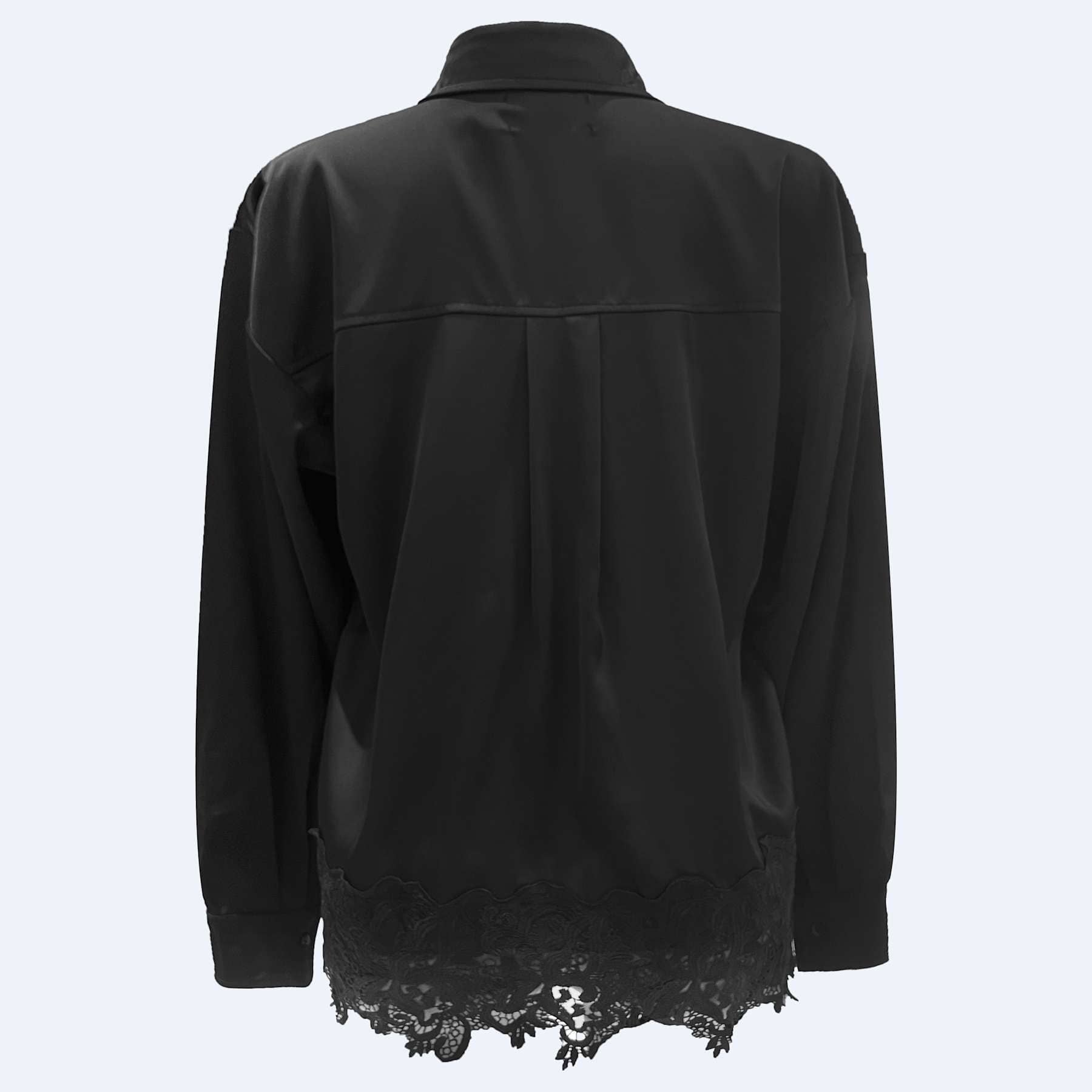Sort skjorte fra Liberte med lange ærmer, knaplukning foran og blondekant nederst. Skjorten har en løs pasform og skjortekrave.