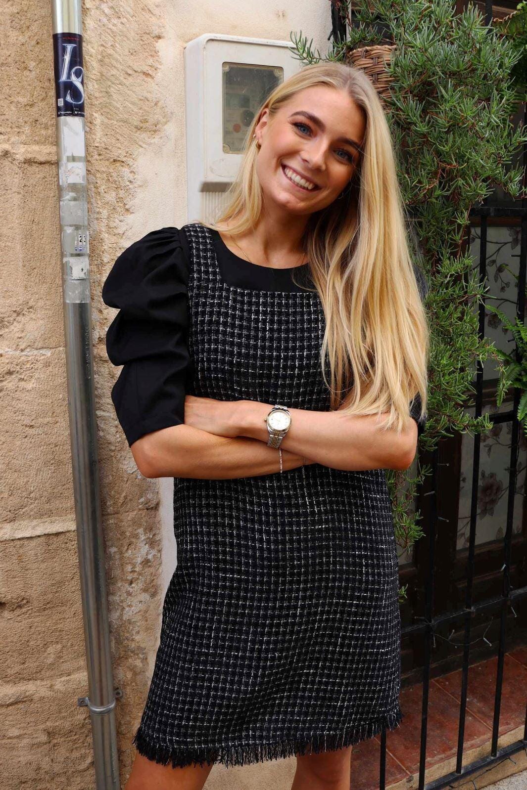 Ternet kjole fra Liberte i grå og sort. Frynsekanterne langs kjolen skaber et råt look, mens det ternede mønster giver et grafisk udtryk.