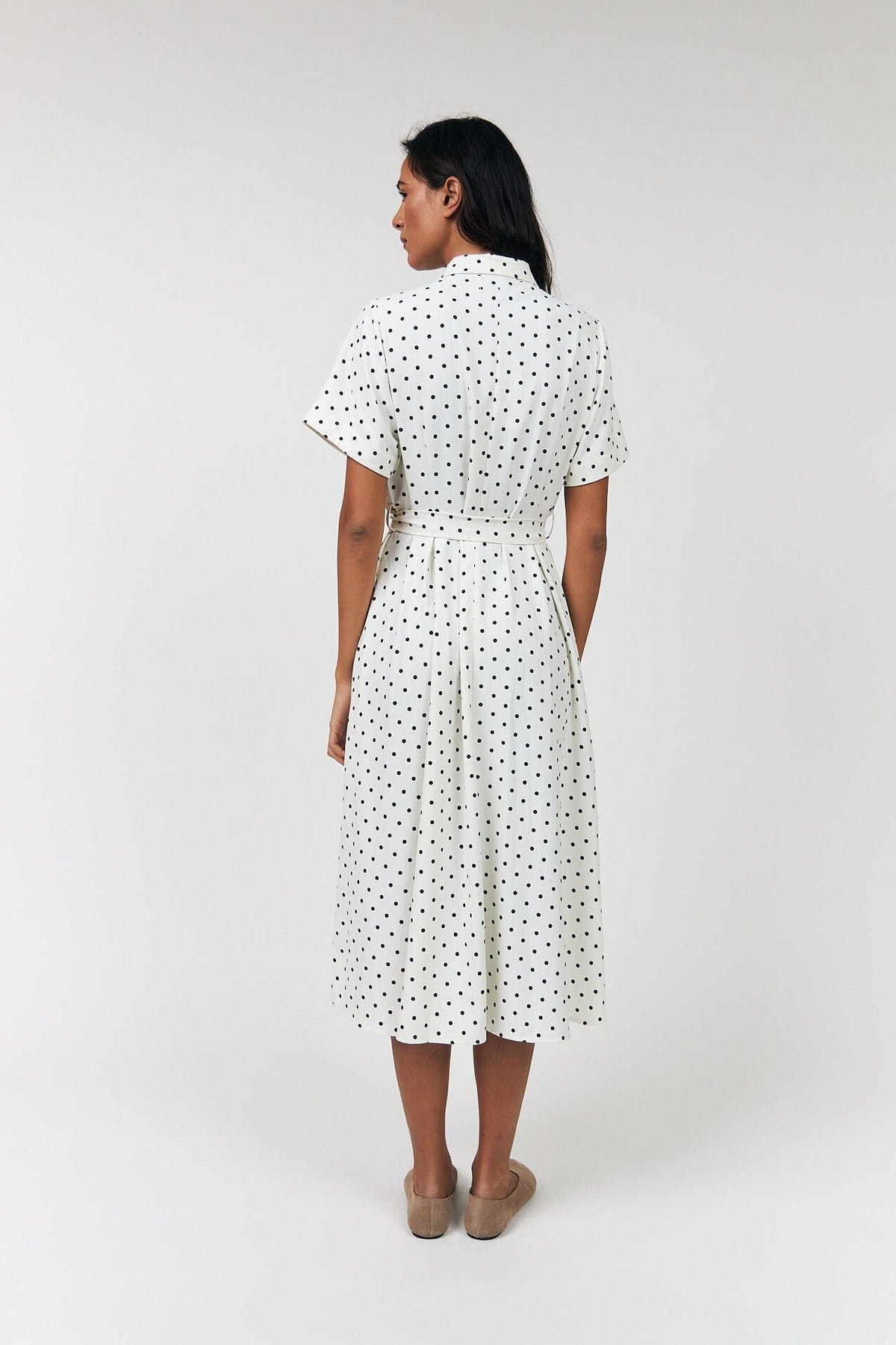 Midi-kjole fra Lollys Laundry med sorte prikker på lys baggrund. Den har skjortekrave, knaplukning foran og bindebånd i taljen. Kjolen går til midt på læggen.