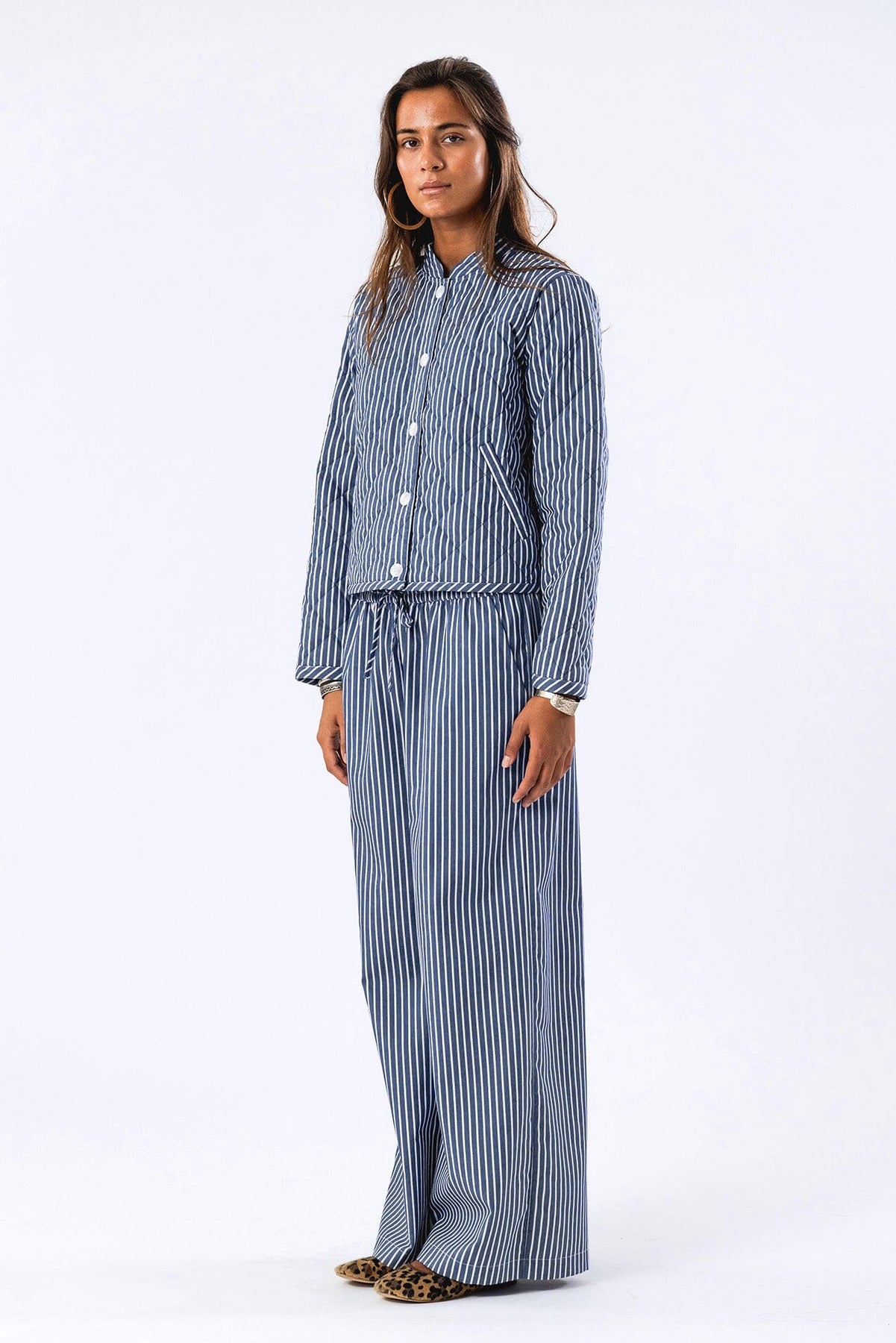 Stribet jakke fra Lollys Laundry i blå og hvid. Jakken har dekorative syninger og en løs pasform med både knapper og snøre.