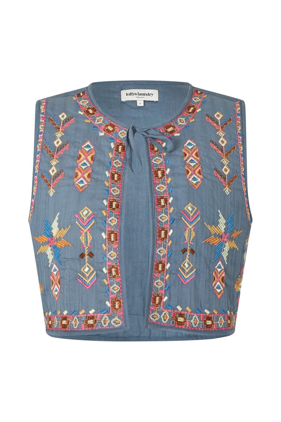 Støvet blå vest fra Lollys Laundry med farverigt broderi. Vesten har en rund hals med bindebånd og er fremstillet i bomuld med detaljerede mønstre langs kanterne.